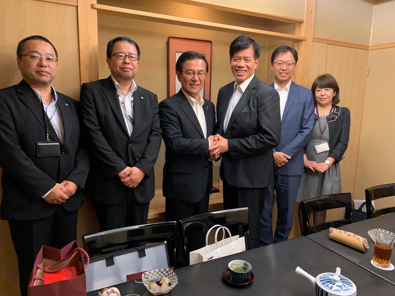 5月23日,陳總領事與山口縣萩市藤道健二市長、高橋博史副市長、綜合政策部齋藤英樹部長、企劃政策課田村佳代子課長共進晚宴。