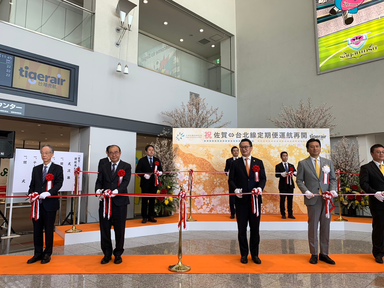 新冠疫情延宕三年後,台灣佐賀航線四月二日重開,是九州除福岡以外,第二個開通的定期直飛航點。佐賀縣知事親自率隊在機場迎客,贈送下機旅客溫馨紀念禮物。 在航班重開的儀式中,山口知事感動的說,翹盼已久的一天終於到來!為佐賀成為九州第二個開通的台灣定期航班感到驕傲。 福岡辦事處陳銘俊處長指出,歷史上佐賀對台灣的歷史建築及教育方面影響深遠,九州與台灣都觀光潛力十足,希望以此為契機帶動雙向經貿、觀光、教育文化交流。虎航董事長陳漢銘致詞時表示,山口知事在疫情期間不停透過書信以及視訊推動復航,又看到近期從桃園到佐賀班機的班班客滿,足以表示我國民眾非常期待能夠前往佐賀,期待更多日本旅客造訪台灣。規劃旅行的易遊網董事長周昀生讚賞佐賀機場翻新後的動線,並估計台灣佐賀復航產值達到8千600萬日圓,幾乎班班客滿。 台灣與佐賀的定期航班於2017年開航,但2020年因為疫情而停航,本次的復航由虎航提供每週四與日各一班往返服務,佐賀機場為繼福岡後第二個恢復定期國際航班的九州機場。
