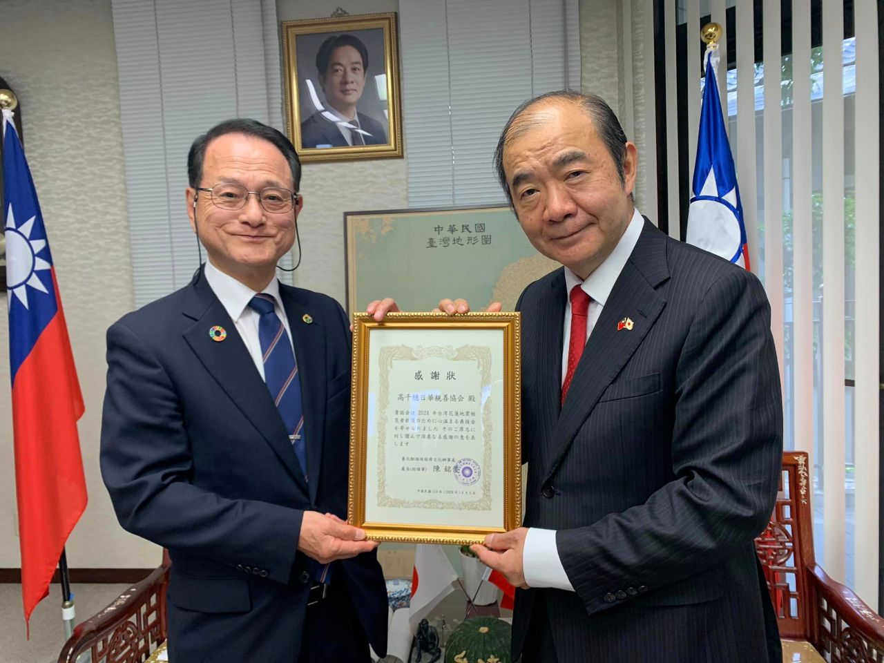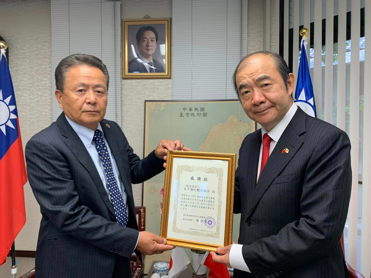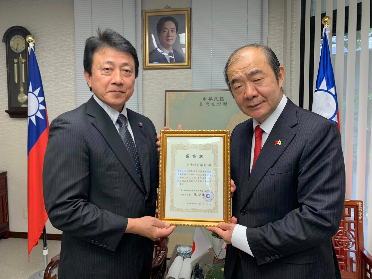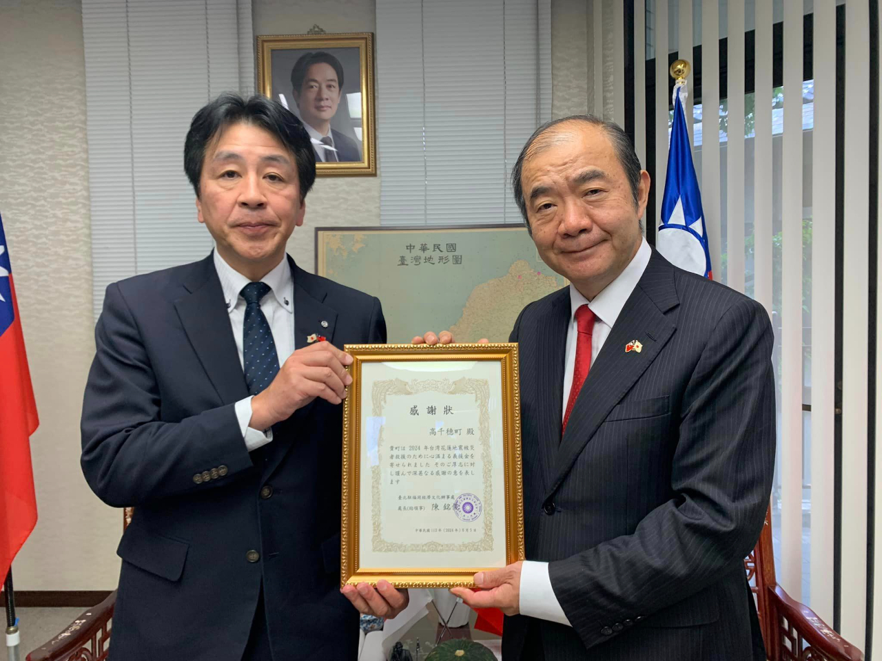 宮崎縣高千穂町甲斐宗之町長、坂本弘明議長、竹尾通洋高千穂町観光協會長及佐藤哲章高千穂日華親善協會長一行6月5日來訪本處慰問。非常感謝各位的加油訊息、千羽鶴及打氣影片。