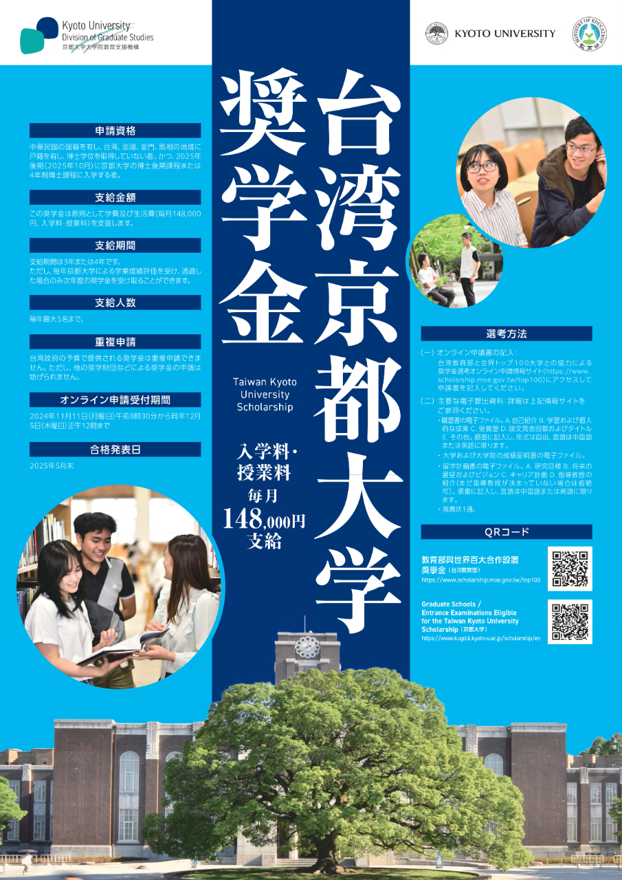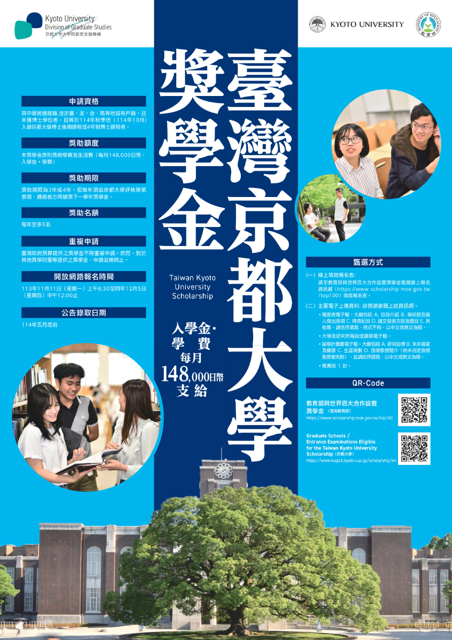 114年「臺灣京都大學獎學金」自11月11日至12月5日開放申請,申請資格為具中華民國國籍,並於臺、彭、金、馬等地設有戶籍,且未獲博士學位者。申請時已在國外留學者亦得申請,惟限申請入學就讀京都大學114年10月秋季班博士課程之新生。申請請至教育部與世界百大合作設置獎學金甄選線上報名資訊網: https://www.scholarship.moe.gov.tw/top100