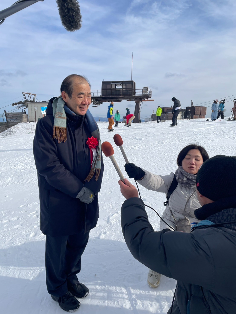開幕儀式後,福岡陳銘俊處長接受NHK等日本媒體採訪,日本國內相當關注「五瀨高原滑雪場」開放訊息。陳處長表示,2022年因颱風來襲通往滑雪場的道路坍塌,迫使五瀨高原地滑雪場關閉了兩個季節,今天看到重新開放,恢復往日熱鬧氣息,感動又欣喜。本年4月花蓮地震,宮崎縣河野俊嗣知事是第一個到辦事處慰問的,宮崎也是日本第一個成立全縣包括市町村議會日台友好議員連盟聯絡會議的縣。近來台灣與宮崎往來更加密切,上(11)月台灣虎行開闢台北-宮崎航線,12月14日宮崎縣河野俊嗣知事訪台與台中市簽署姊妹縣市交流協定,讓宮崎縣成為台中市在日本締結的第1個姊妹市。近期日隈俊郎及佐藤弘之兩位副知事亦分別訪台,充分顯示雙方友好程度。