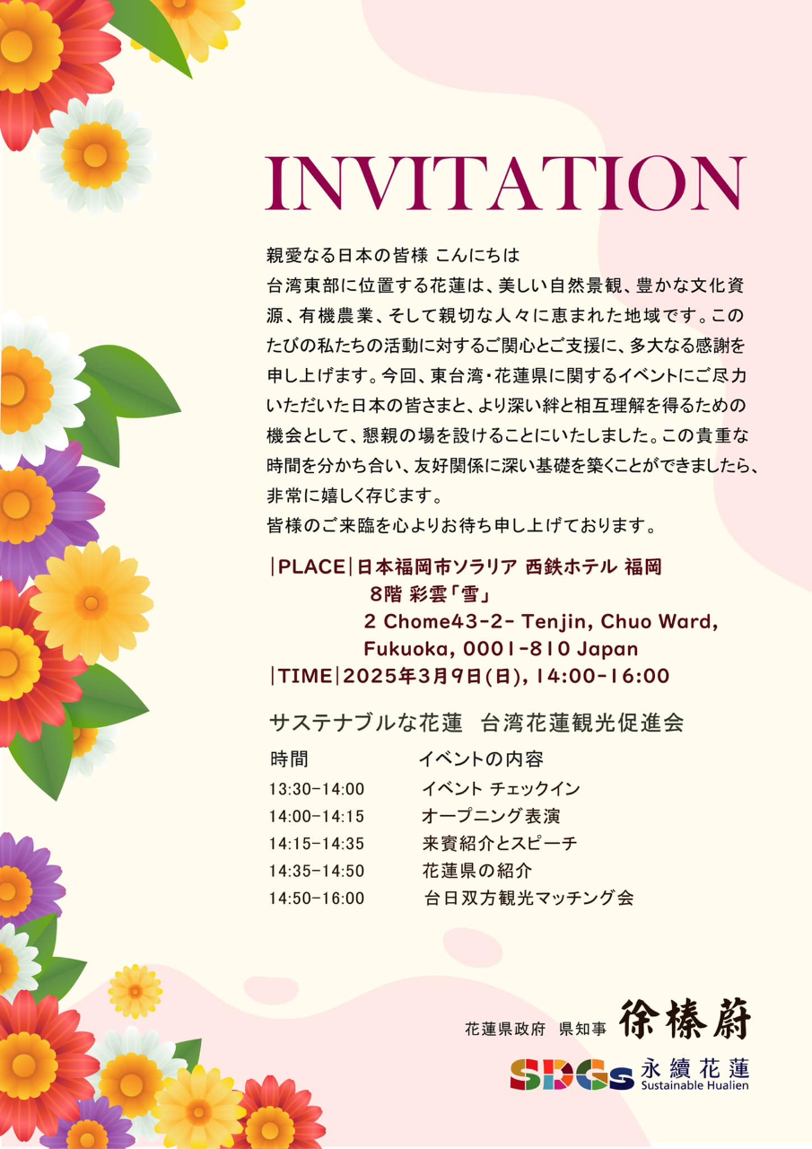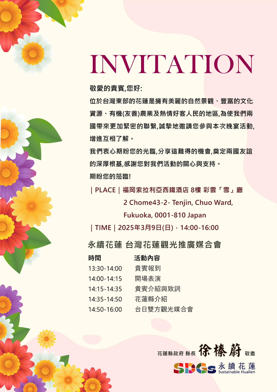 活動現場設置花蓮美食品嘗與介紹區,包含茶(蜜香紅茶與柚花茶)、鳳梨酥(文旦酥)、牛肉米麵(粉)、麻糬、剝皮辣椒等。歡迎您們當天蒞臨指導。