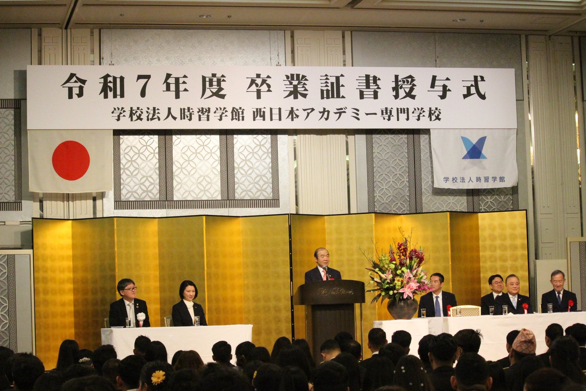 僑務顧問蔣惠萍女士經營的西日本專科學院(西日本アカデミー専門学校)2025學年度畢業典禮於3月12日上午在New Otani Hotel博多舉行,駐福岡辦事處陳銘俊總領事及陳登元副領事出席祝賀。