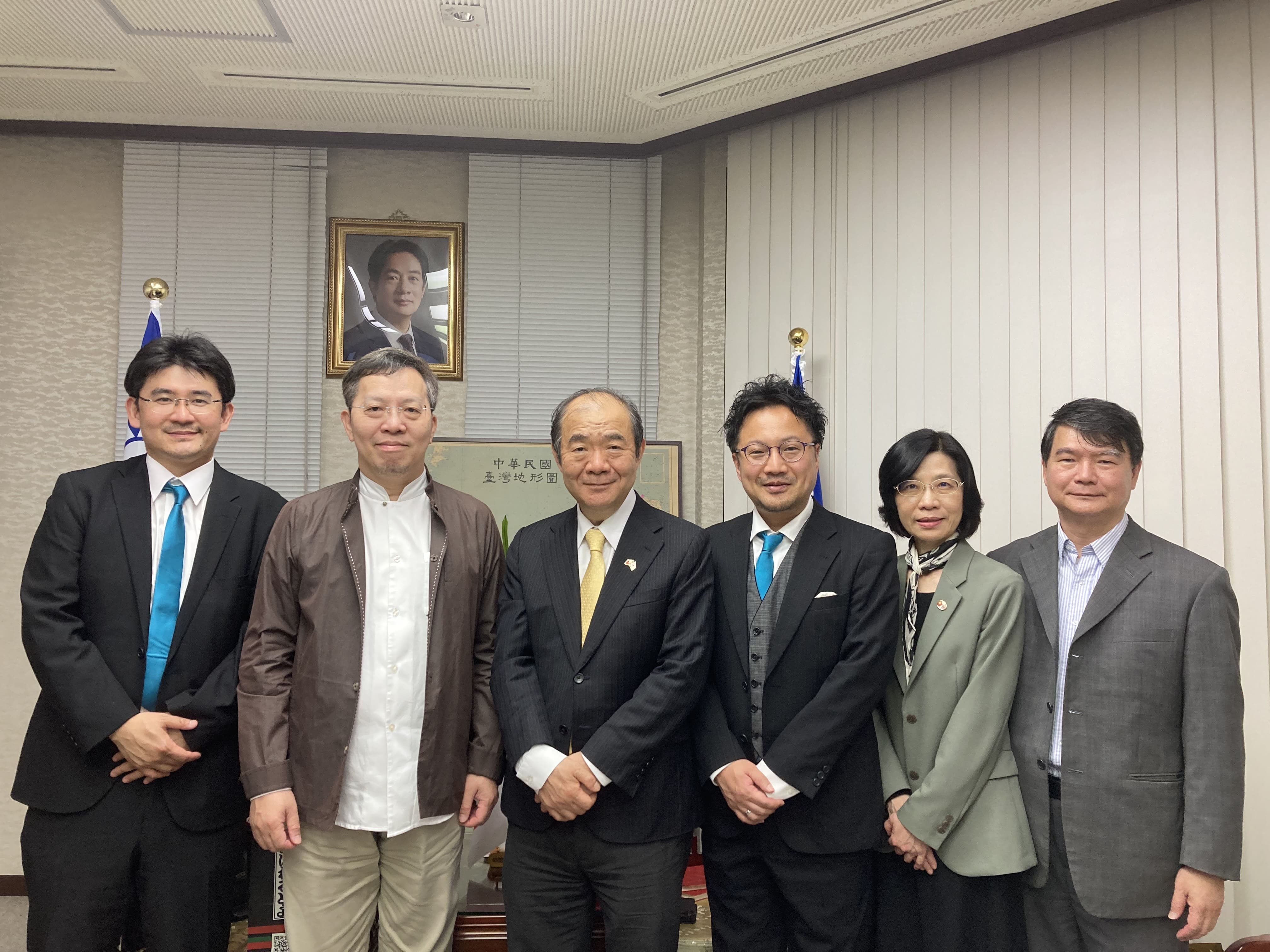 陳總領事銘俊(中)接待台灣藝術家交響樂團音樂總監呂景民(中左)、RENTARO交響樂團九州代表森田良平(中右一)、熊本縣玉名市魅力發信大使林慧諭(中右二)洽談台灣樂團本年9月來九州交流演出事宜。
