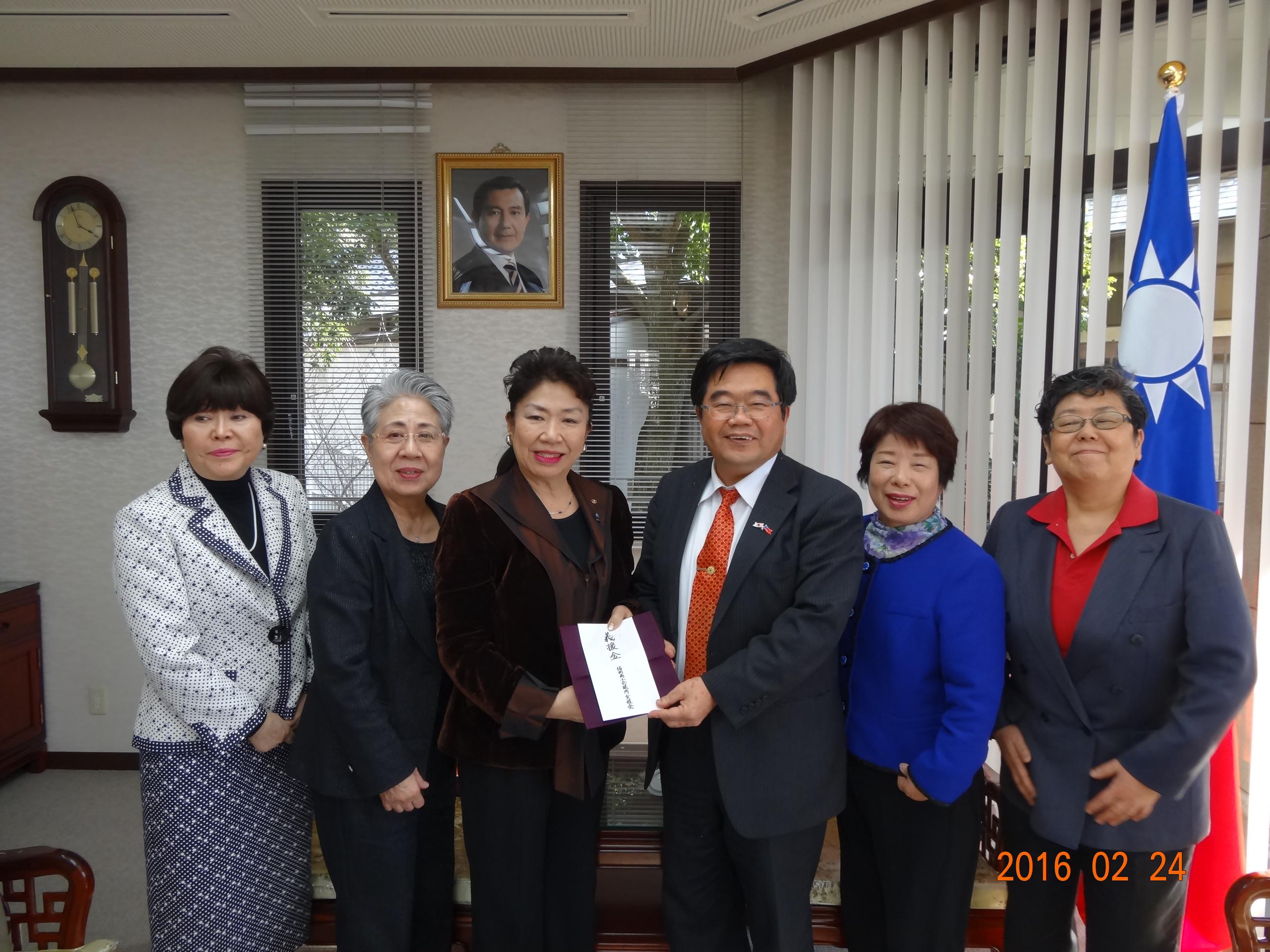 2月24日,戎總領事接受福岡商工會議所女性會西川會長捐獻台灣南部大震災賑災金。