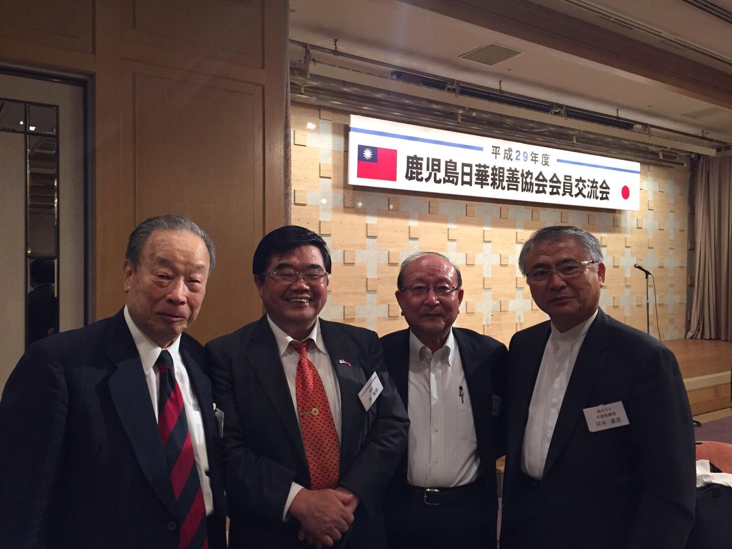 鹿兒島日華親善協會平成29年度總會ㄧ2017.6.29 駐福岡辦事處處長戎義俊偕總務課長李杰宏應邀出席平成29度鹿兒島日華親善協會總會,出席者包括:台灣的鹿兒島各大學的留學生12名,鹿兒島台灣蓬萊會會長陳怡如3名,鹿兒島台灣之會佐藤通弘等7、8位「灣生」,以及鹿兒島縣工商各界,總共約60名參加。 戎處長以「台灣人尊敬的日本精神」為題進行45分鐘的演講,獲致滿場熱烈鼓掌的回響。演講結束之後,許多人纷纷前來向戎處長致意,表示非常感動,強調現在在日本社會,很難聽到如此讓日本人深省的話,原來台灣與日本有如此深厚的連結,無怪乎近年來台日兩國關係如此密切,民間各項交流如此蓬勃發展。 最讓人高興的是今天有野村稔等8位高齡的「灣生」參加,更證明兩國關係的雋永長存,源遠流長,年長前輩這ㄧ族群,功不可沒呀!