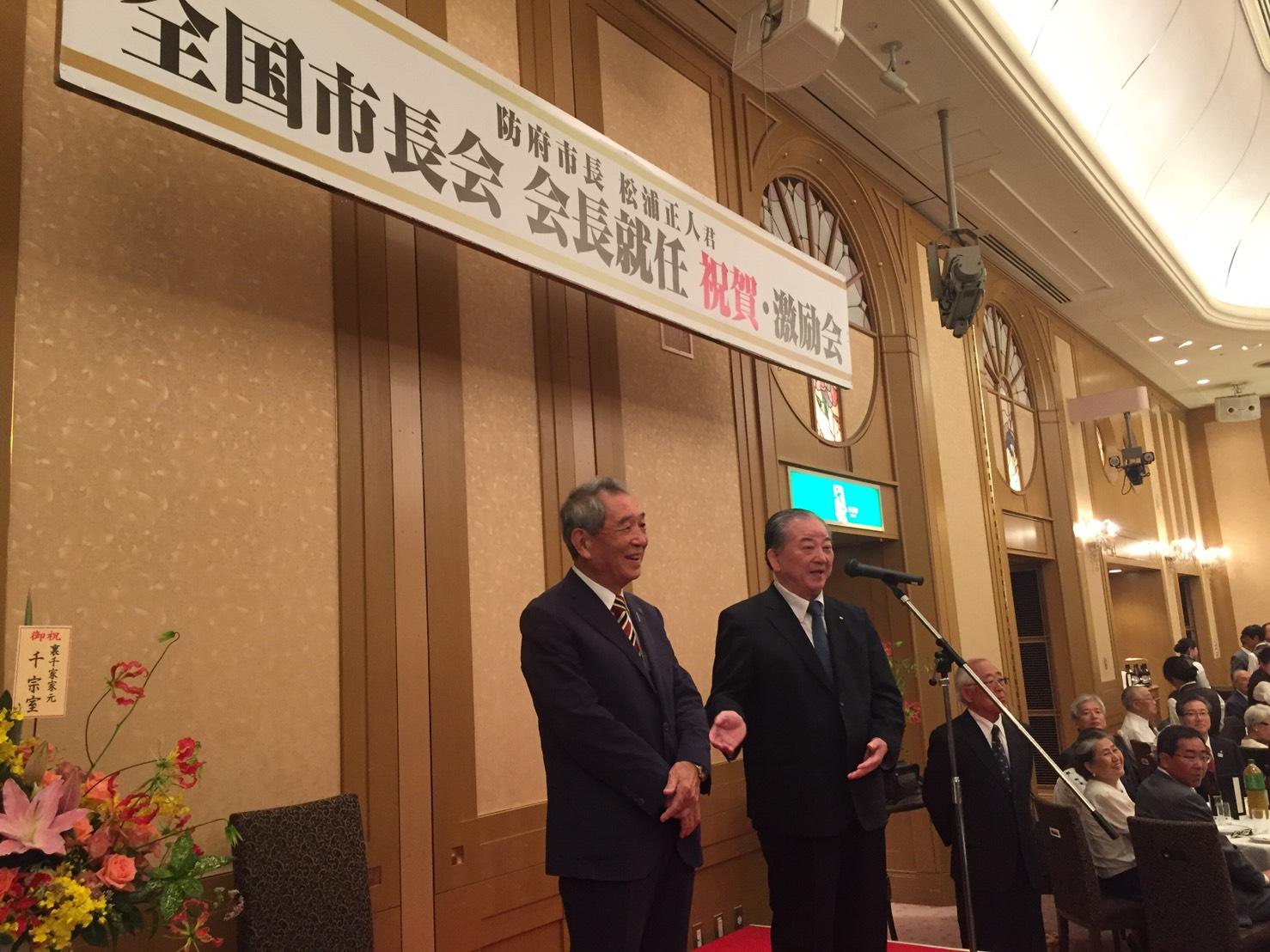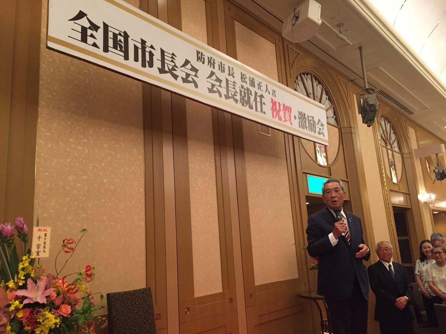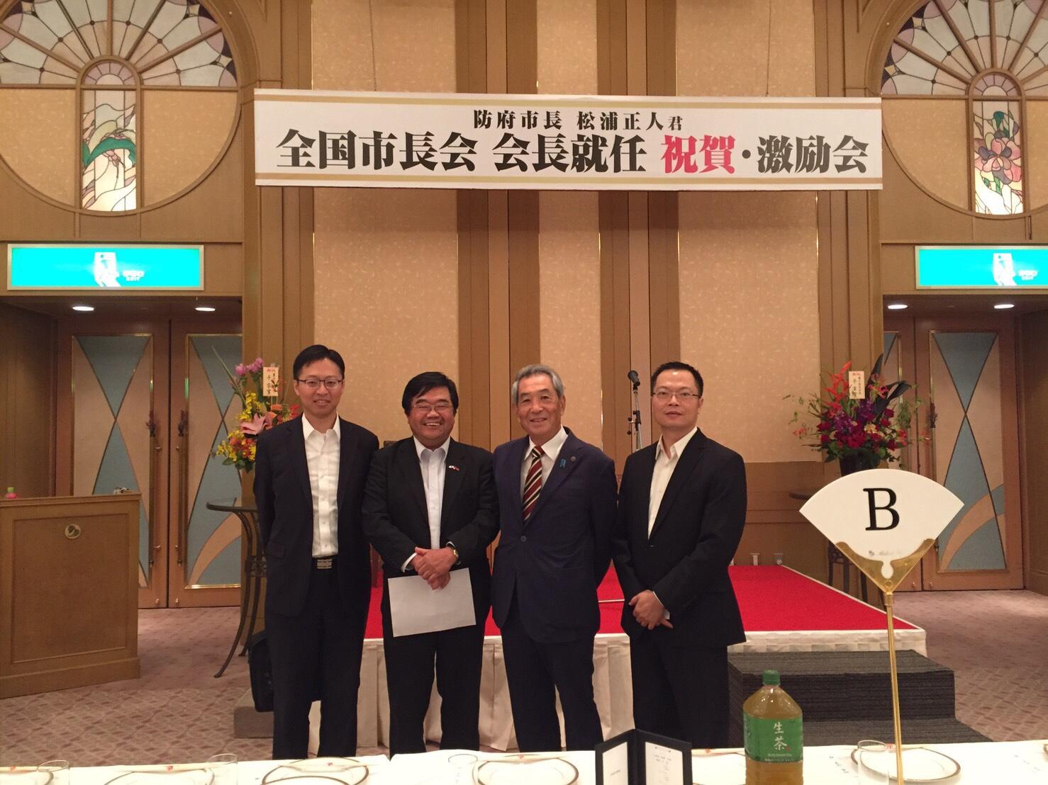 日本全國市長會會長松浦正人就任祝賀會 旨揭祝賀會全國約五百人參加,福岡辦事處處長戎義俊偕總務部長洪臨梂及涉外課長李杰宏出席,會場冠蓋雲集,擠得水洩不通,盛況驚人。山口縣知事村岡政嗣、議會議長柳居俊學等,以及山口縣內的市長及鄰近的岡山市長亦出席盛會。 防府市長松浦正人75歲,42歲當選山口縣議員,11年2個月在任,其間2年半落選失意,55歲首度當選人口11萬人的防府市長,至今五任20年,今年6月7日被選為全國814市的全國市長會會長,其中橫濱市400萬人、名古屋市250萬人,以11萬人的防府市長榮膺會長,山口縣是空前之舉,今日連安倍首相都以錄影發表賀詞,渠與安倍首相父親,已故外務大臣安倍晋太郎是世交,從小看安倍首相長大;松浦市長在日本的政商人脈,無人出其右。 他非常親台灣、支持台灣,去年5/20蔡總統就職大典,他是以私人朋友身分,成為座上嘉賓。松浦市長,長年熱心教育,戮力從事教育改革,為市政及全國教育奔走,日以繼夜,精神令人感動。 他有10個孫子,全家合樂融融,兒子、媳婦、孫子都是防府市民。本是含飴弄孫之齡,仍然為國為民奔波,令人動容,成為眾人的榜樣。 戎義俊 2017.7.30,下午5時於防府市