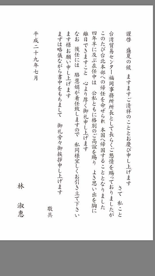7月28日調返台北本部,在福岡4年半的任期中,於公於私都受到大家特別的照顧,實在是太感謝了。當日到機場送機的朋友,或想來機場卻無法前來的朋友,感動啊!總而言之,感謝啊! 回到台灣後,也將促力於台日貿易及文化交流,未來也請繼續支持和協助。