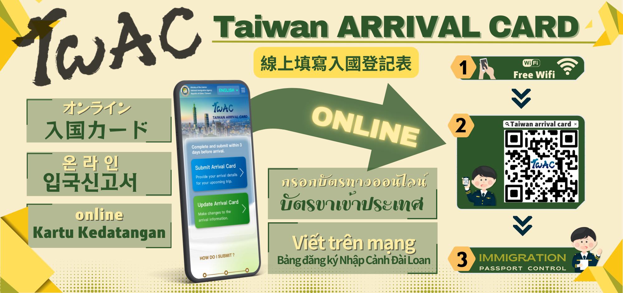 All travelers who are not nationals of the Republic of China (Taiwan) and do not hold a Taiwan Resident Certificate are required to complete the Taiwan Arrival Card upon entry. Travelers may fill out a paper Arrival Card upon arrival or submit the form online within three days prior to arrival via the official website: https://twac.immigration.gov.tw/.
