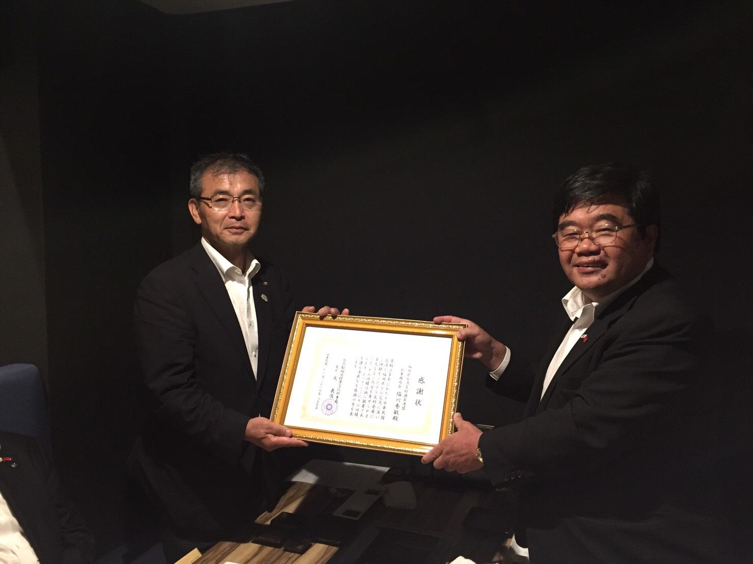 中華民国政府を代表し、福岡県議会日台友好議員連盟前会長及び事務局長に感謝状を贈呈ㄧ2018.8.8 駐福岡辦事處處長戎義俊は、食事会を設け、掲題の議員連盟前會長加地邦雄先生に感謝状を贈呈した。加地先生は、任期6年の間、台日地方議員交流や2014年10月に開催した國立故宮博物院ㄧ神品至宝展の成功、台日両国文化芸術交流に貢献。また塩川秀敏前事務局長は、議会交流及び日本の大学生と台湾の留学生の意見交換会を設けて下さり、学生間の国際交流に貢献。この度の感謝状贈呈は、改めて感謝の意を表したものである。 同時に、新任の井上忠敏会長と中牟田伸二事務局長への激励でもあり、素晴らしい伝統や基礎構築を受け継ぎ、今後も互いに両国の地方議会の交流を強化する事に邁進したいという思いである。 また、九州台日文化交流会本鄉啟成執行長が、台中市議会と福岡県議会の交流にも全力を注いで奔走している事に対し、感謝している。よって、この度、贈呈の立会人として同席して頂いた。 戎義俊 2017.8.8