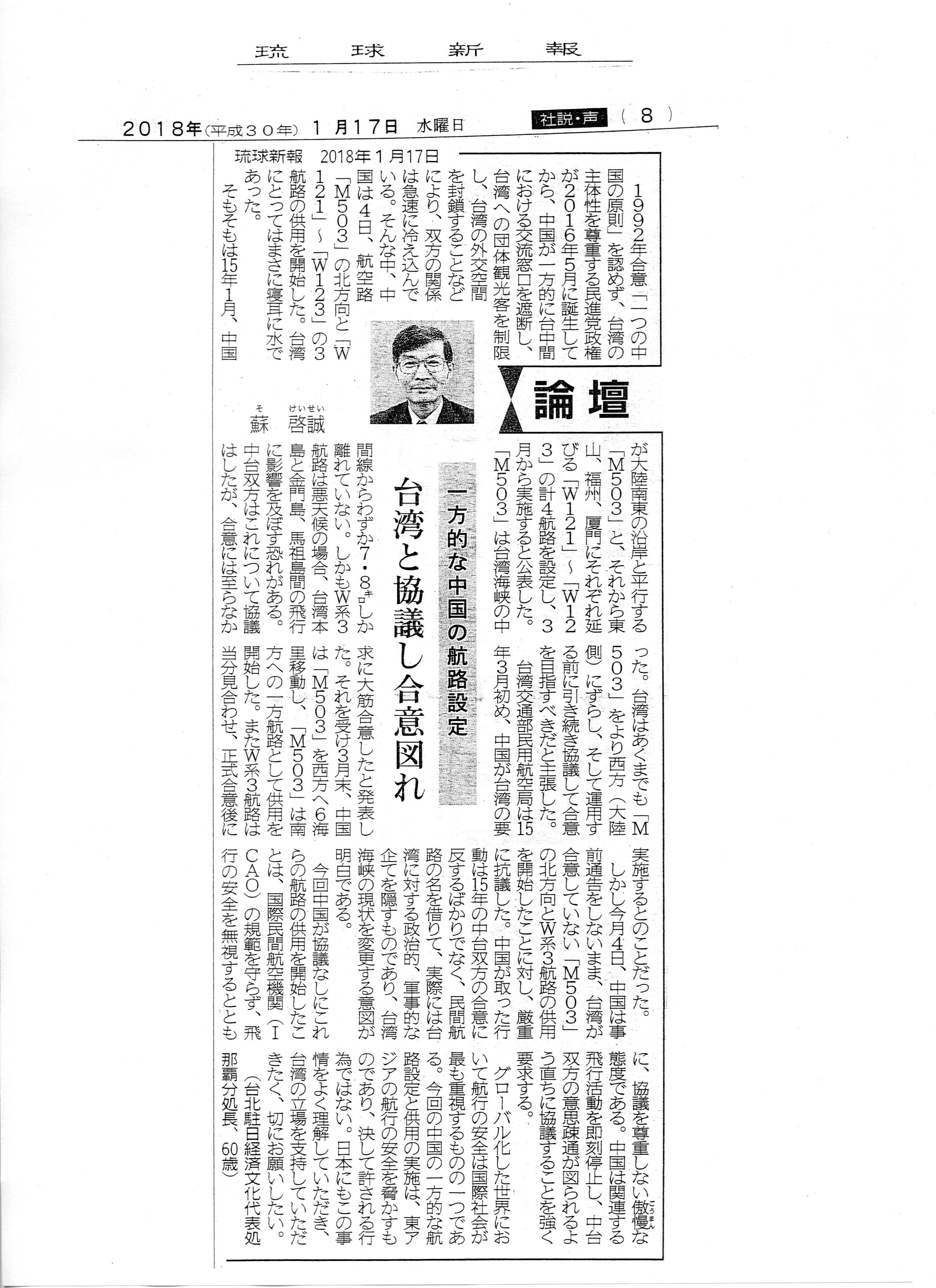 此間「琉球新報」於2018年1月17日(星期三)在該報論壇刊出本處蘇啓誠處長就M503等爭議航線,以「中國片面設定航路-應與臺灣共商尋求解決」為題之投書。該投書原文及中譯文如附,敬請 參閱。