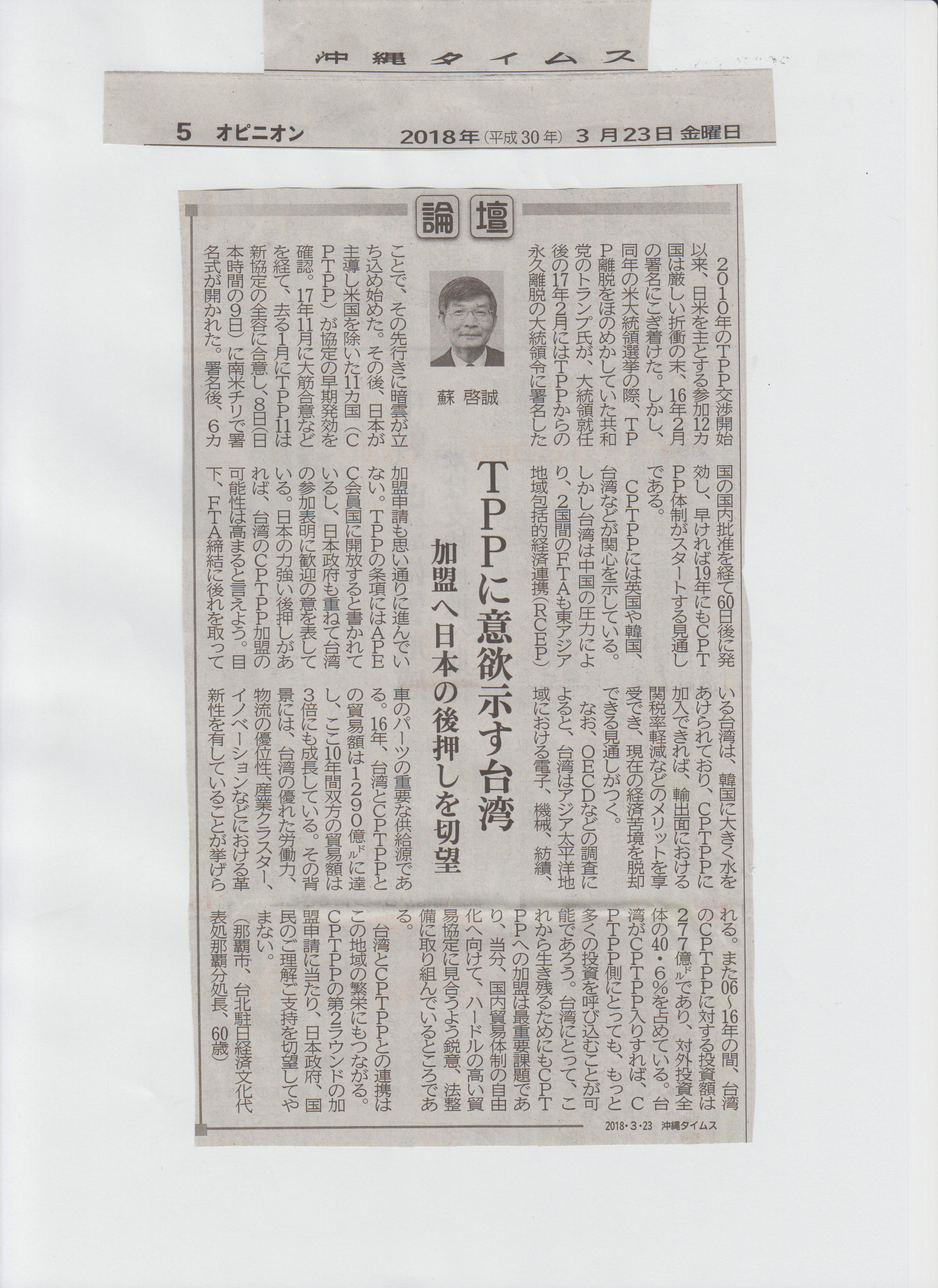 蘇啓誠處長投書 2018/03/23沖繩時報論壇「台灣有意加入TPP,籲請日本支持台灣加盟」