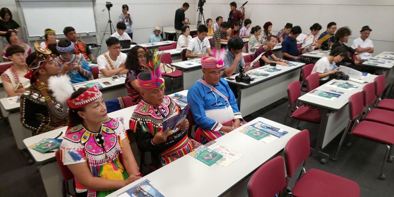 出席記者會之我國原住民音樂家與沖繩音樂家等全體人員合影。