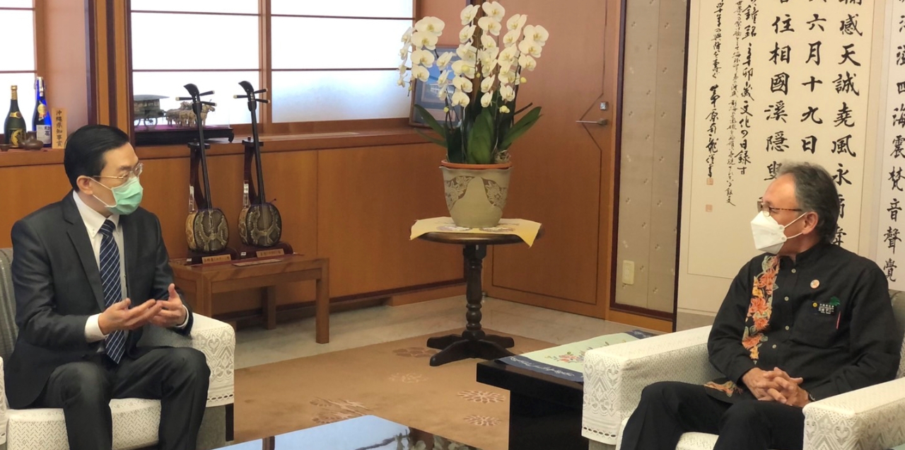2022/03/09 本處范振國處長(左)前往沖繩縣廳拜會縣知事玉城丹尼(右),說明即將奉調回國,並就邊境解封後如何促進台沖雙邊交流事宜交換意見。