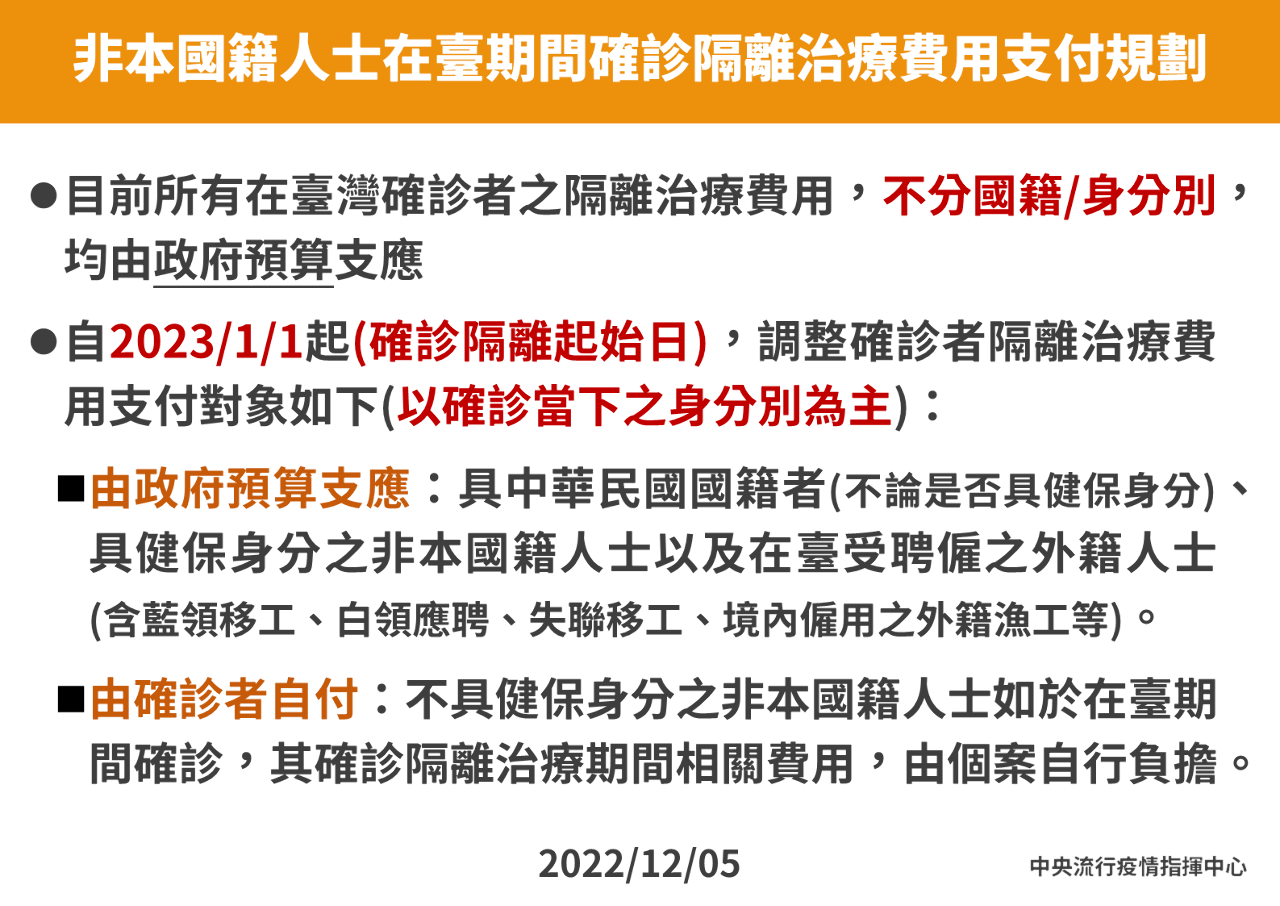 台湾の新型コロナウイルス感染症対策本部「中央感染状況指揮センター」は2023年1月1日より全民健康保険に加入していない外国籍が台湾に滞在中新型コロナ陽性となった場合、隔離や治療にかかる費用を自己負担とすると発表した。外国籍には、旅行客、短期留学生なども含まれる。