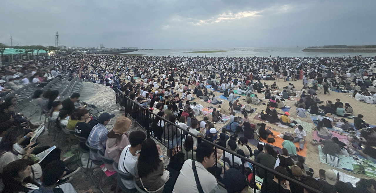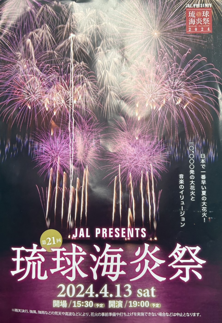 2024/04/13当処の王瑞豐処長ら一家は沖縄県宜野湾市にて開催された「琉球海炎祭」を観覧しました。朝からの大雨で中止が心配でしたが、午後からは晴れ間が広がり無事開催されました。会場を訪れた人数の統計はありませんでしたが、台湾からの観光客は去年よりも多く感じました。今年の花火大会について感動したところは2点ありました。 1. 代表挨拶による我が国で起きた花蓮地震に対する言葉。「琉球海炎祭」のパンフレット内にて花蓮地震に触れ、募金を呼び掛けられていました。また、催しの最中には、司会や松川宜野湾市長、仲本実行委員長らが挨拶時に会場にいる台湾人観光客に対し花蓮地震への気遣いの言葉、会場内に設置されている募金箱への募金を呼び掛けていただきました。実は4月3日の地震発生当日、松川宜野湾市長や呉屋宜野湾市議会議長をはじめとする政界の多くの方々からお気遣いの言葉をいただき、大変心温まる思いでした。 台湾人に耳なじみのある2曲を選曲。五月天の「乾杯」と夏川りみが歌う「時の流れに身をまかせ」(中国語「我只在乎你」)に合わせて花火が打ち上げられました。「乾杯」の歌詞に「今日こそがいつか、ずっと君に言ってなかった感謝の言葉を、君とまた乾杯」とあります。