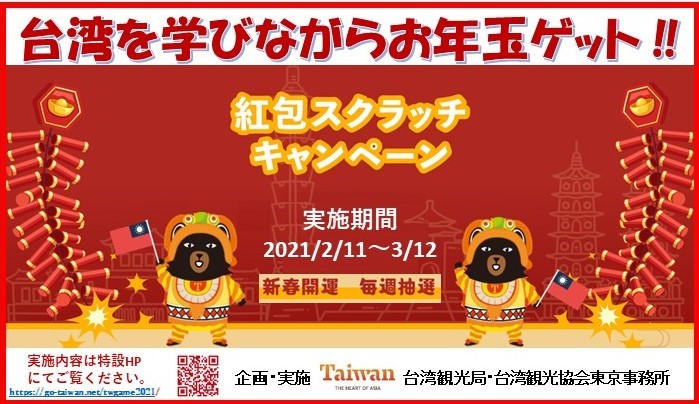今年2021年の春節元旦は、2月12日(金)でした。家族団欒で過ごす伝統的な春節ですが、多くの人が新春に宝くじを買って、運試しを行います。そこで台湾観光局東京事務所より春節にちなんで、「手遊び台湾」シリーズとして2021年2月11日(木・大晦日)から3月12日(金)まで、1ヶ月の期間限定で、開運チャレンジとして、お年玉プレゼントが貰えるオンラインスクラッチゲーム『紅包(ホンバオ)スクラッチキャンペーン~台湾を学びながらお年玉ゲット』を開催いたします!