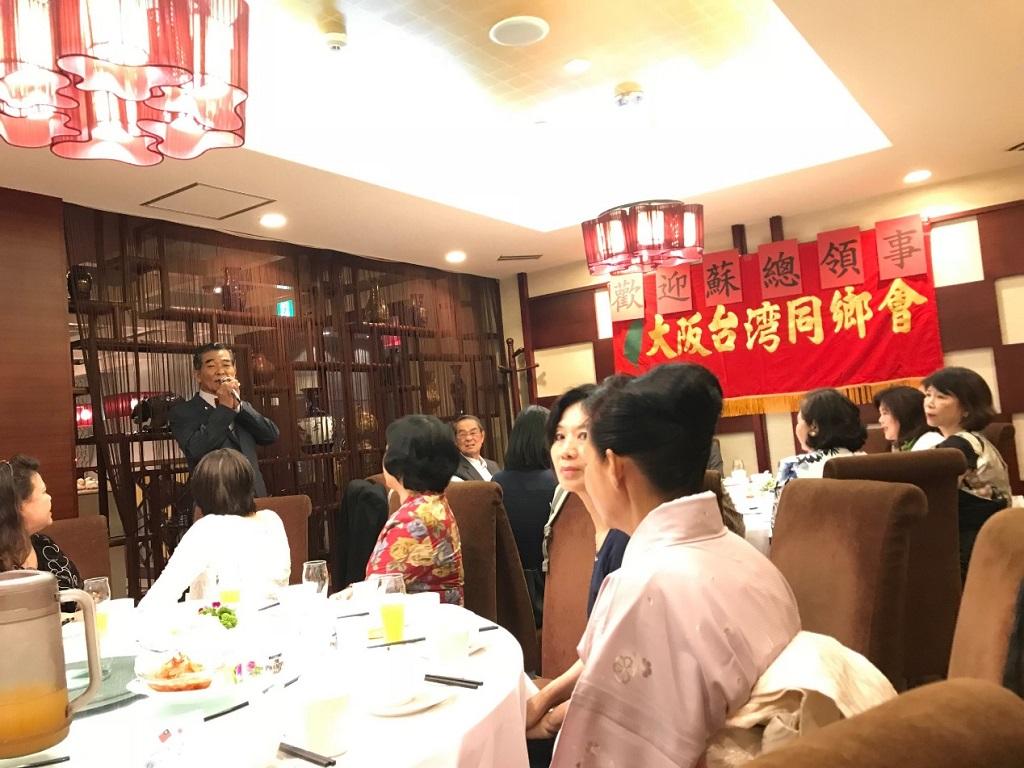 蘇處長致詞感謝大阪台灣同鄉會熱情設宴款待,並讚揚大阪台灣同鄉會在歷任會長用心經營下,凝聚鄉親向心力,團結一致、會務蓬勃發展。