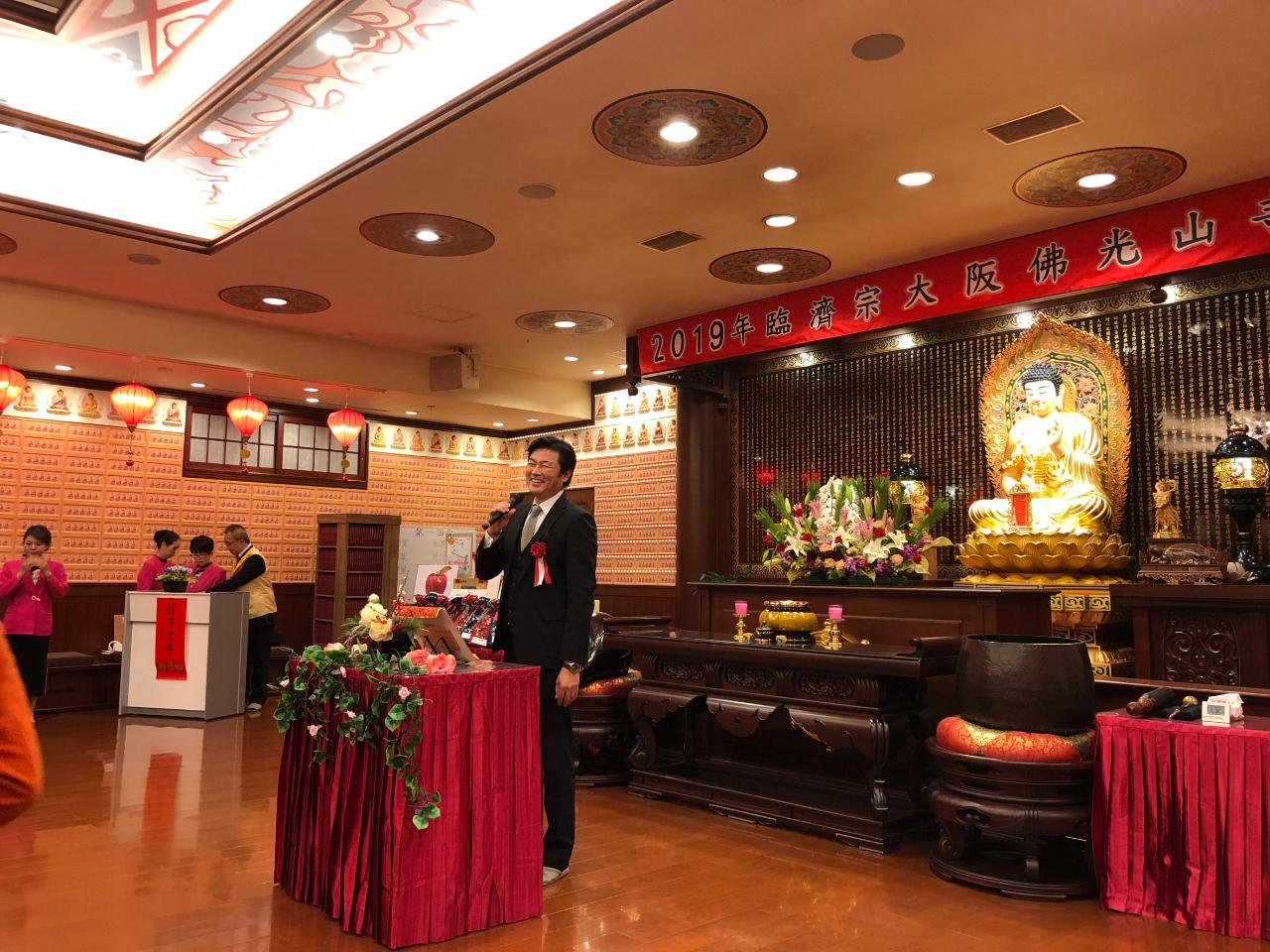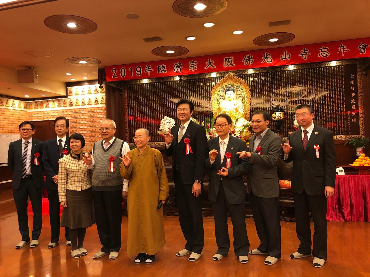 駐大阪辦事處李世丙處長偕張永賢副處長、林明秋組長等於本(108)年12月8日出席臨濟宗大阪佛光山寺忘年會,由住持覺用法師主持,國際佛光會大阪協會松田振興會長及豐田秋雄、林裕恆、張元禮子督導等熱情協助接待,計有日本關西台商協會俞秀霞會長、關西崇正會城年德會長、世華關西分會洪麗華會長、大阪中華總會林學謙事務局長等大阪關西地區團體代表、僑胞及日本社福團體代表200餘名與會,李處長致詞時感謝大阪佛光山協助推展台日交流、致力慈善關懷及協助處理旅日國人、僑胞急難救助等。會中並穿插華僑及日本社福團體才藝表演,另安排歲暮抽獎活動等,場面溫馨熱絡。