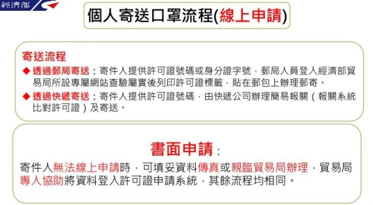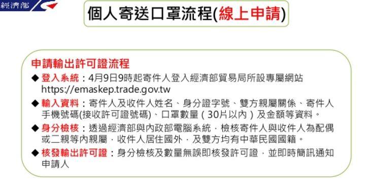 申請輸出許可證流程 1.登入系統:4 月9 日9 時起寄件人登入經濟部貿易局所設專屬網站https://emaskep.trade.gov.tw 2.輸入資料:寄件人及收件人姓名、身分證字號、雙方親屬關係、寄件人手機號碼(接收許可證號碼)、口罩數量(30 片以內)及金額等資料。 3.身分檢核:透過經濟部與內政部電腦系統,檢核寄件人與收件人為配偶或二親等內親屬,收件人居住國外,及雙方均有中華民國國籍。 4.核發輸出許可證:身分檢核及數量無誤即核發許可證,並即時簡訊通知申請人。