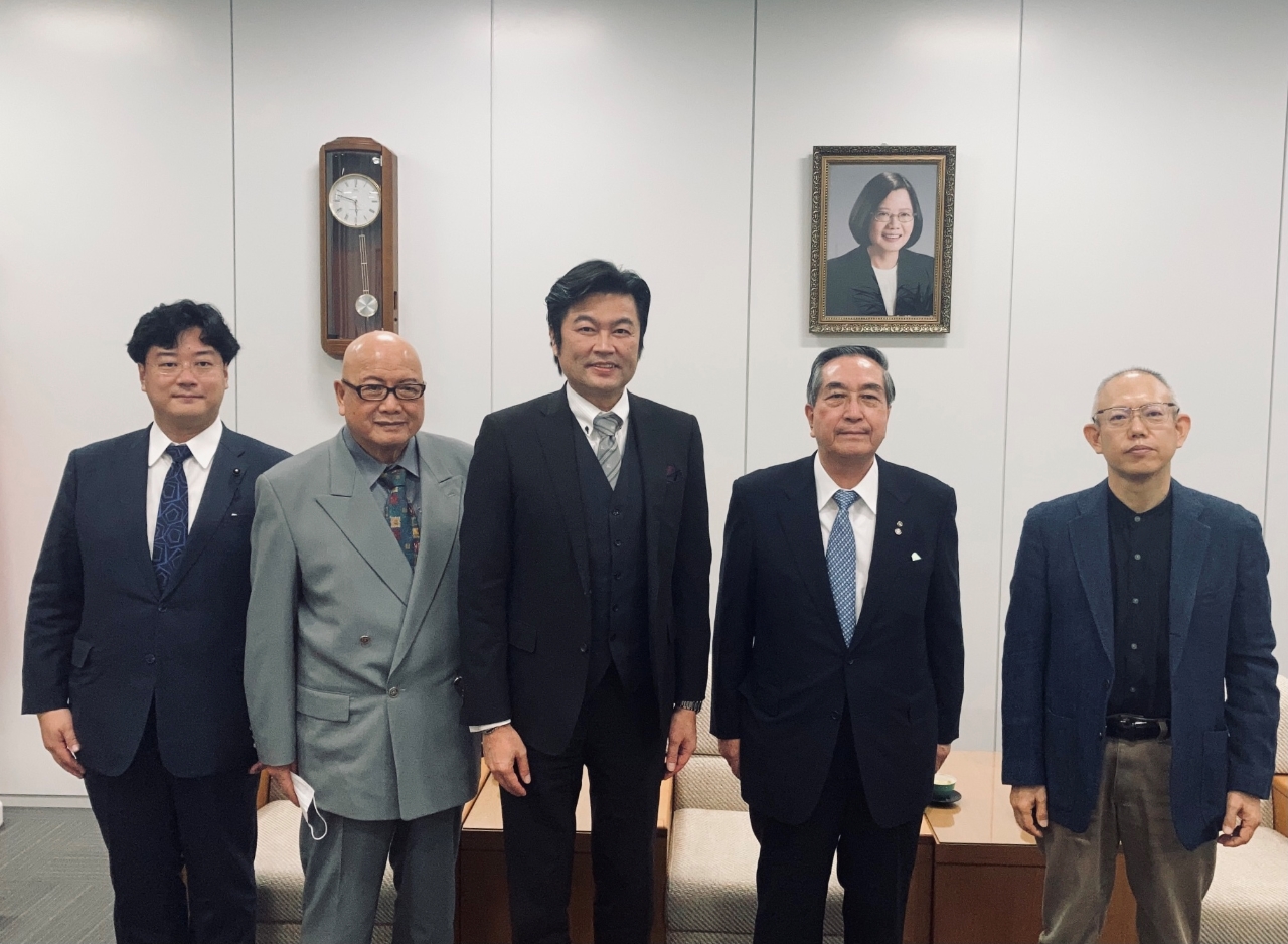 (左至右)山木茂議員、太原武夫副會長、李處長、山木靖雄會長、上水流久彥教授