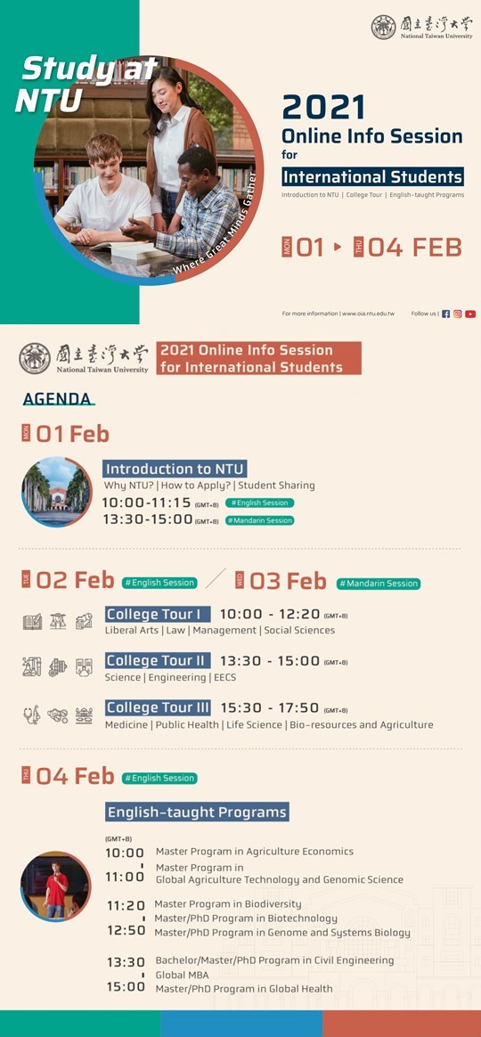 該校國際學位生2021年9月入學申請第二階段已開放,將於今2021年2月1日(一)至4日(四)舉辦線上招生說明會 (活動資訊連結:http://bit.ly/3hNqK4f),期望透過直播方式,讓各國學生零距離地認識臺大;內容概括學校介紹、申請方式、學院介紹以及全英授課學程等等。