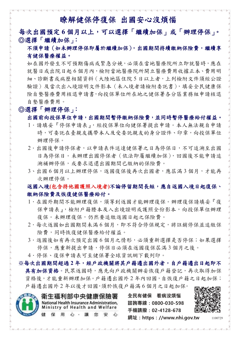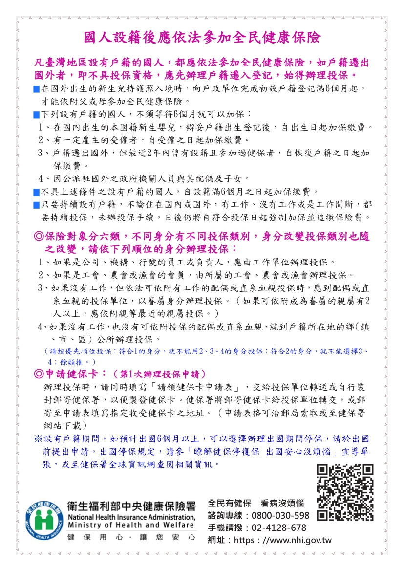 近來有些自國外返臺辦理恢復戶籍民眾,因不知設籍後應參加全民健康保險,或在臺設有戶籍未完成投保手 續及選擇是否辦理停保即出境,致事後遭追繳5年內保險費。 有戶籍應加健保,出國可辦停保,未辦追繳。如有疑問,
