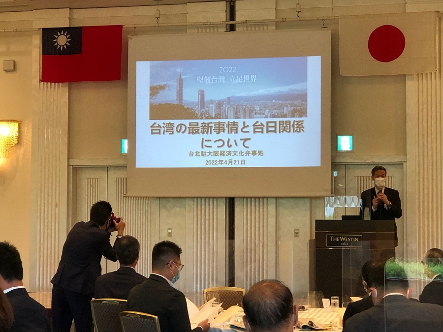 駐大阪辦事處向明德處長於本(111)年4月21日偕同林明秋組長、李碧娟秘書及陳浩明先生出席「大阪日華親善協會」假大阪威斯汀飯店舉辦之例會,並以「台灣最新事情(現況)及台日關係」為題發表專題演講。與會者包括該協會廣田元孝理事長、中山正暉前眾議員、岡下昌平前眾議員、中山泰秀前眾議員秘書茂原英仁、大阪市議會竹下隆議員、「大阪中華總會」加來重信會長、洪里勝信名譽會長、大阪中華學校連茂雄理事長、兆豐國際商業銀行大阪支店長蔡宗豪、中鋼駐大阪代表蔡昇峰、「李登輝之友會」辻井正房副會長、高知縣日台親善協會大阪支部長貴志陽一、新日本海新聞社吉岡徹社長、讀賣電視山川友基解說委員、產經編集中心佐藤泰博代表、大阪日日新聞深田巧總局長及該協會幹部、會員等40餘人。