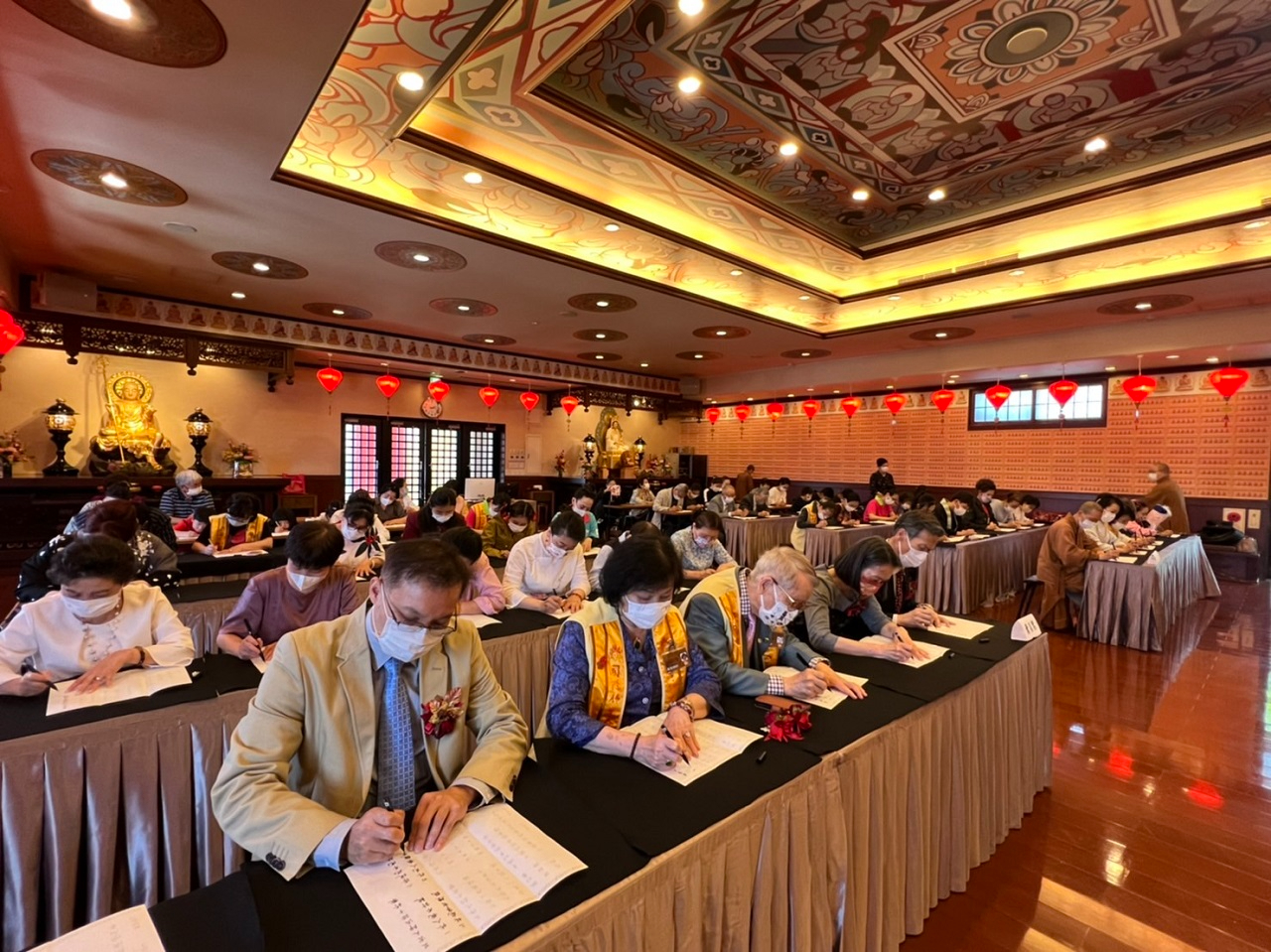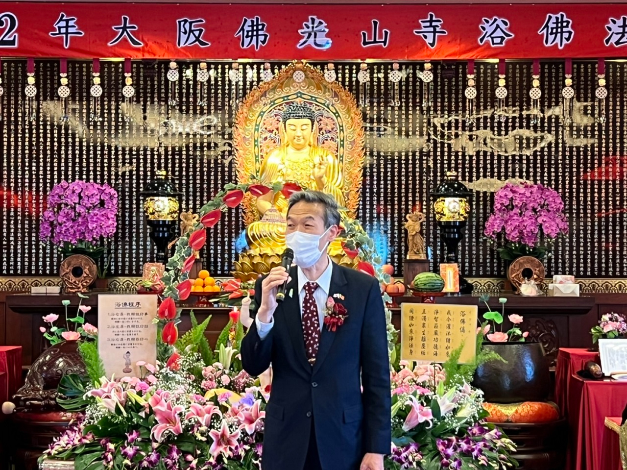 本(111)年5月8日大阪佛光山寺舉行浴佛法會暨母親節祝福禮等活動,駐大阪辦事處向明德處長偕夫人周淑玉女士、張永賢副處長及楊慧萍僑務秘書出席法會。法會由獻供隊伍手持香、花等進場揭開序幕,續由法師帶領唱誦〈浴佛偈〉等,並邀現場參與者浴佛淨心灌沐太子聖像。因當天適逢母親節,寺方請向處長代表致贈康乃馨予夫人。向處長也祝福在場嘉賓母親節快樂,活動另安排抄經及二胡演出,希望藉此淨化心靈,活動逾百人共度盛會,場面隆重莊嚴且溫馨。