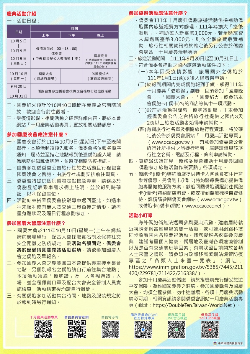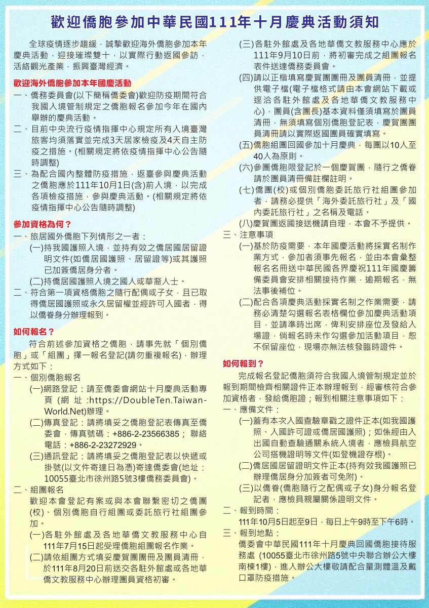 十月慶典僑胞報名相關資訊,詳見僑務委員會官網 連結:https://reurl.cc/zNb9pe