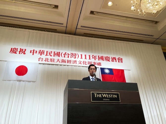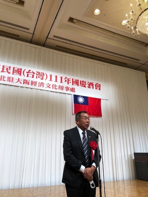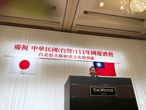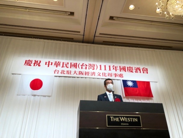 駐大阪辦事處於本(111)年10月7日在「ウェスティンホテル大阪」舉辦111年國慶酒會,由向明德處長主持,包括前防衛大臣稻田朋美眾議員、谷川とむ眾議員、和田有一朗眾議員、瀧波宏文參議員、香川縣西原義一副知事、大阪府議會鈴木憲議長、「大阪日華親善協會」廣田元孝理事長、「大阪中華總會」郭重信會長等轄內政要、議員聯盟、親善團體、華僑團體、經濟文教媒體領袖及各界友我人士等共計約500餘人出席,日本經濟安全保障擔當大臣高市早苗等57位政要亦於事前向本處表示祝賀之意。
