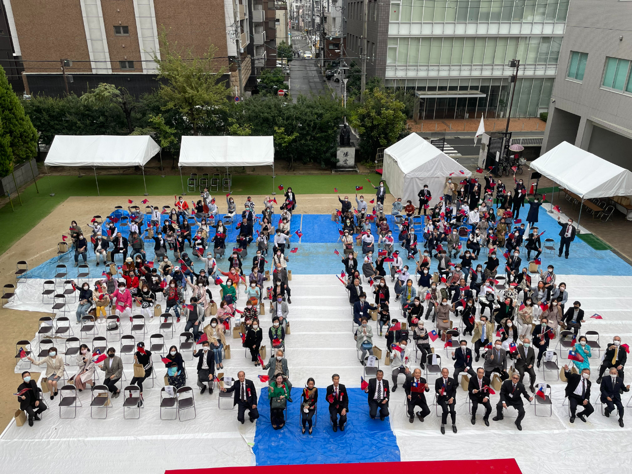 大阪中華總會於本(111)年10月10日上午在大阪中華學校操場舉行慶祝111年雙十國慶升旗典禮,駐大阪辦事處向明德處長夫婦及同仁應邀出席共襄盛舉。出席人員包括大阪中華總會郭重信會長、洪里勝信名譽會長暨幹部、會員,以及轄區各僑會團上島彩會長、島田惠會長、陳鳳玉會長等多位僑領及學校師生約200人。活動在會場高唱中華民國國歌揭開序幕,接續伴隨國旗歌,國旗冉冉在學校的屋頂升起,場面盛大隆重。