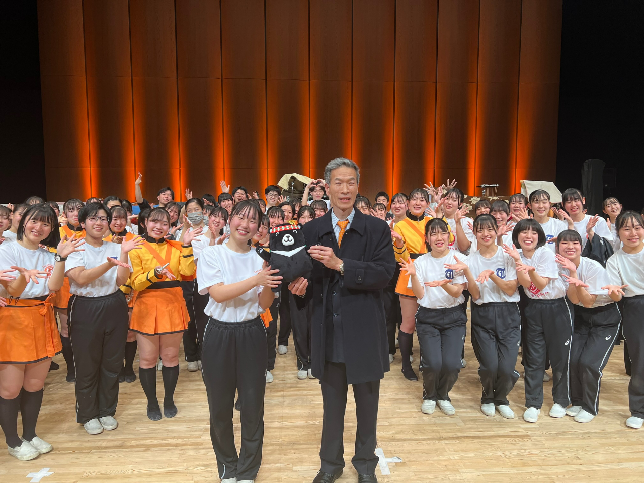 演出結束後,向處長親自贈送「台灣黑熊」布偶,感謝去年團員們赴台參與雙十國慶演出時帶給大家的無限感動,並期許京都橘高校與訪台期間協助接待的北一女中加強交流,讓台日年輕世代接棒鞏固兩國情誼。