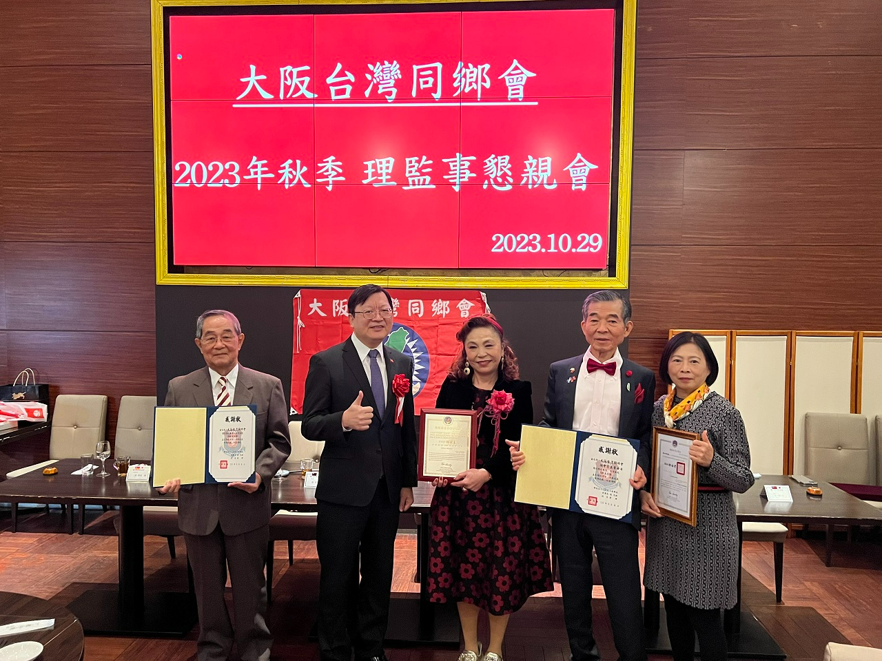 駐大阪辦事處洪英傑處長本(112)年10月29日偕員出席「大阪台灣同鄉會理監事懇親餐會」,餐會由謝美香會長主持,出席人員另包含該會名譽會長、顧問及理監事約30餘人。洪處長並代表僑務委員會頒發銀質獎章予同鄉會謝會長以及會員岡田路子女士,感謝日前分別捐款予大阪中華學校協助校務發展。