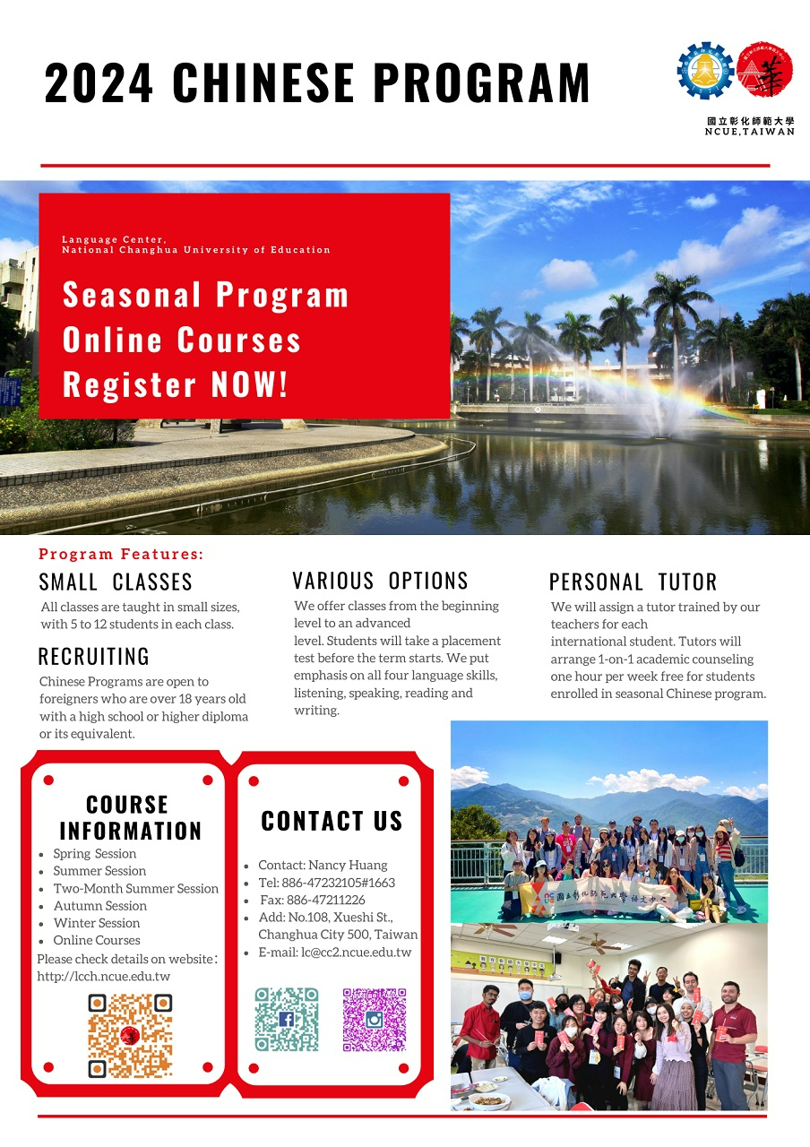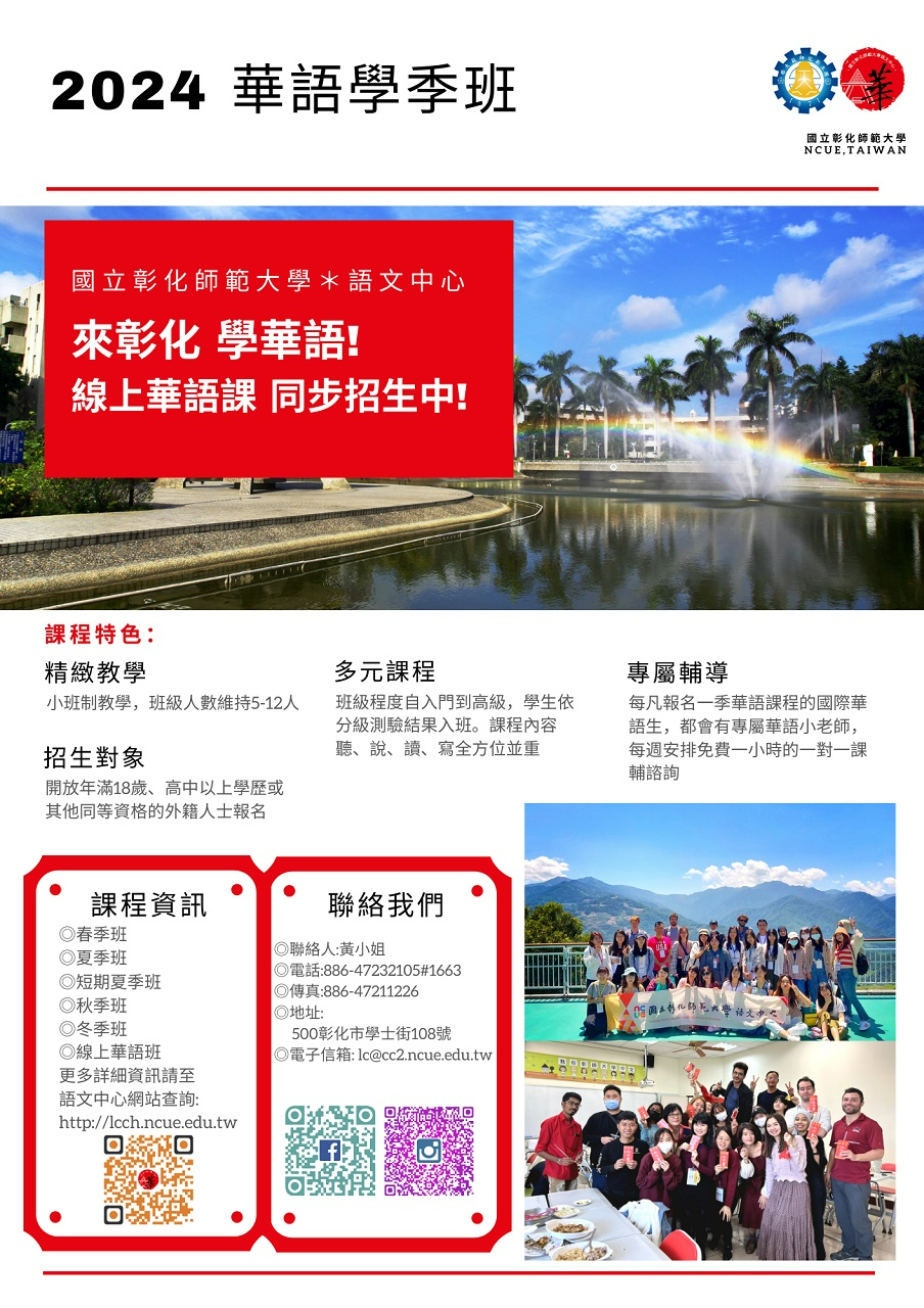 國立彰化師範大學校語文中心「2024年華語學季班及線上課程」招生中