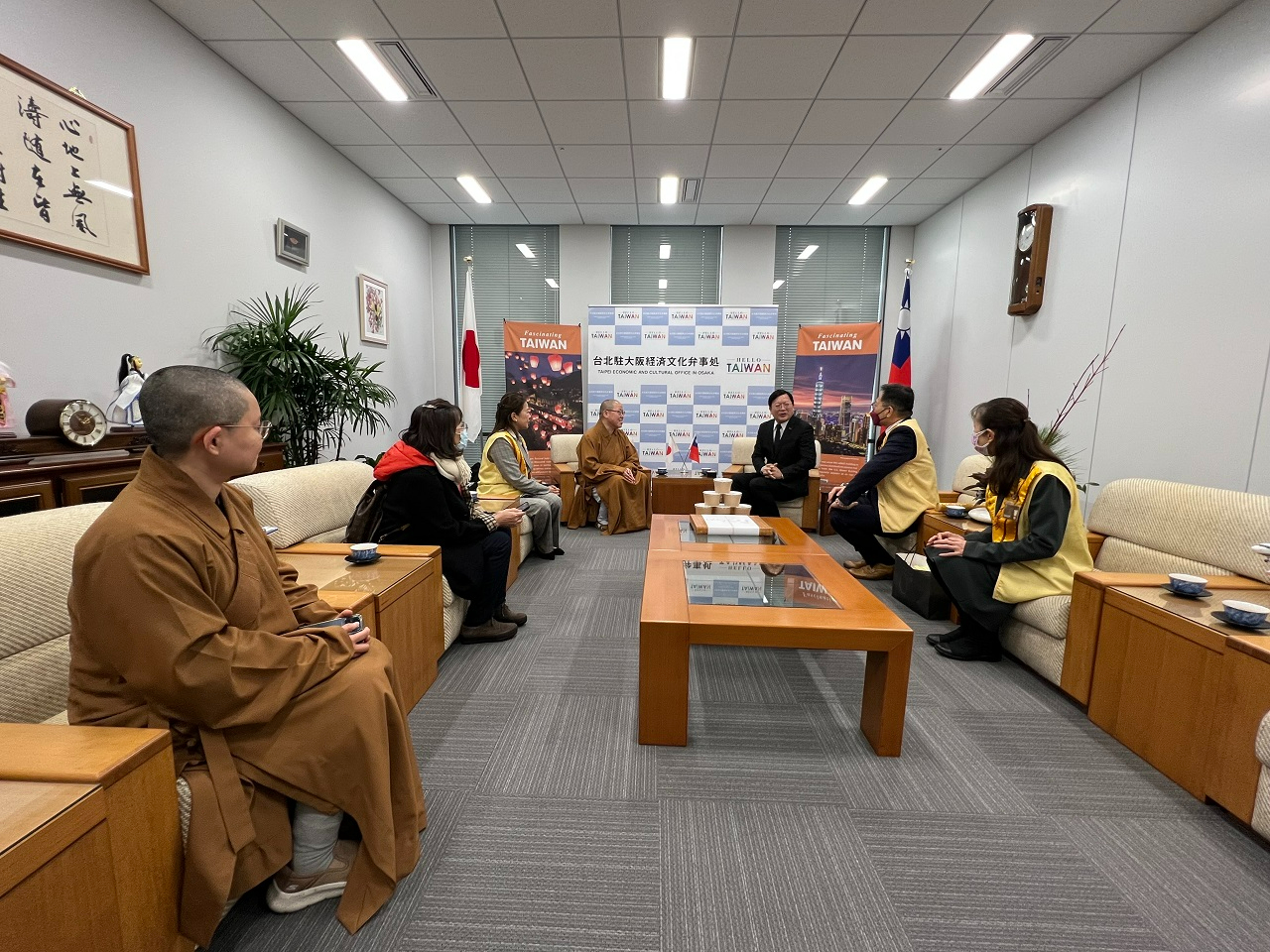 本(113)年1月18日大阪佛光山寺副住持如泉法師、知因法師、國際佛光會大阪協會陳鳳玉會長及松田振興督導等人來處新年拜會,由洪英傑處長接見。如泉法師分享日前載運物資親至石川縣七尾市慰問震災災民以及募集物資情形,洪處長感謝渠等無私奉獻。佛光山寺更準備臘八粥、平安御守及星雲大師「雲水自在 祥和歡喜」墨寶掛軸等物品與辦事處結緣,期望大家都能平安健康。