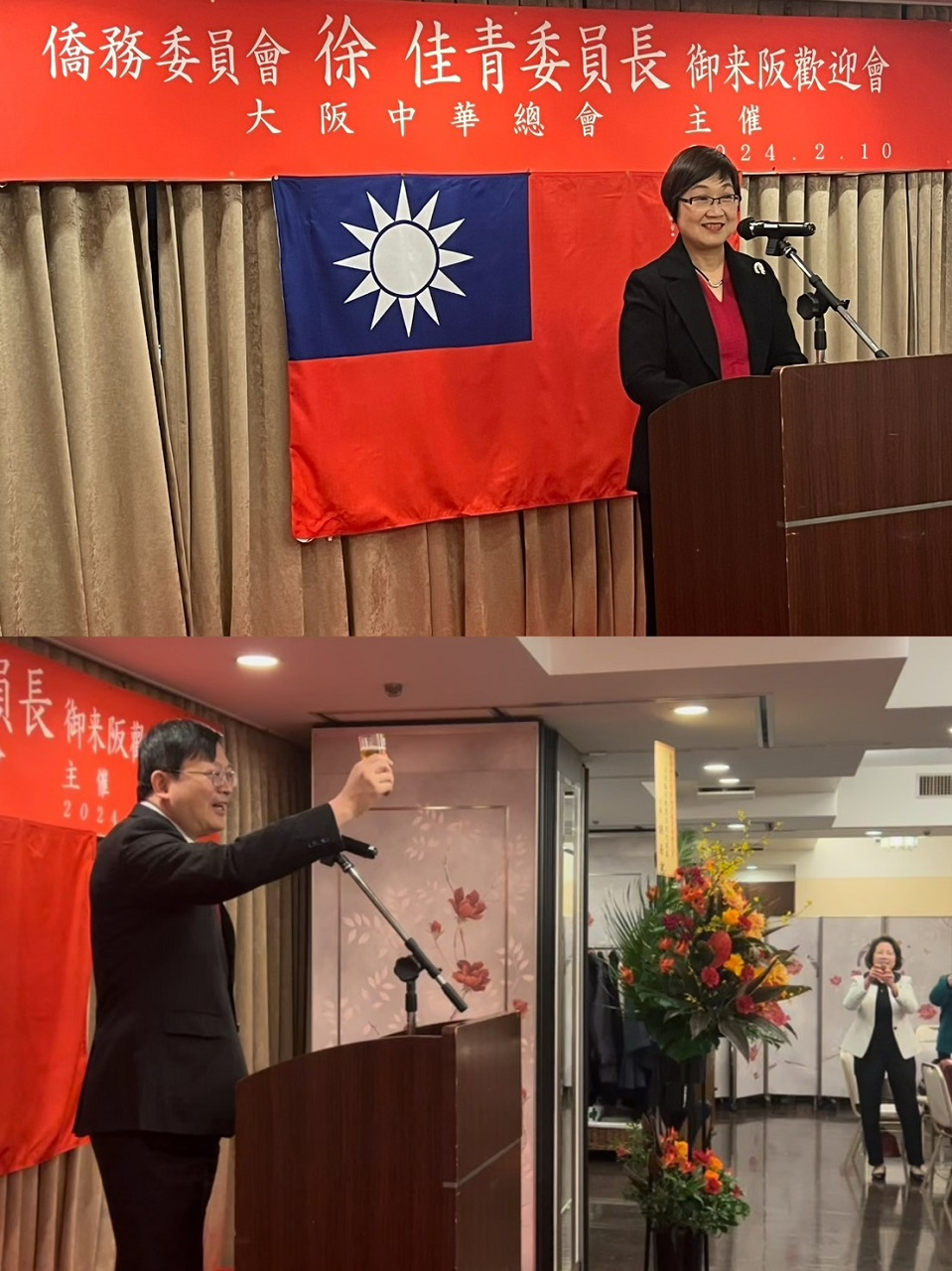 僑委會徐佳青委員長由駐大阪辦事處洪英傑處長陪同,於2月10日晚間出席大阪中華總會舉辦之歡迎餐會、11日上午出席「第22回大阪春節祭」、下午與世界華人工商婦女企管協會日本關西分會幹部茶敘、出席僑青座談,傍晚訪視京都華僑總會並與幹部座談。