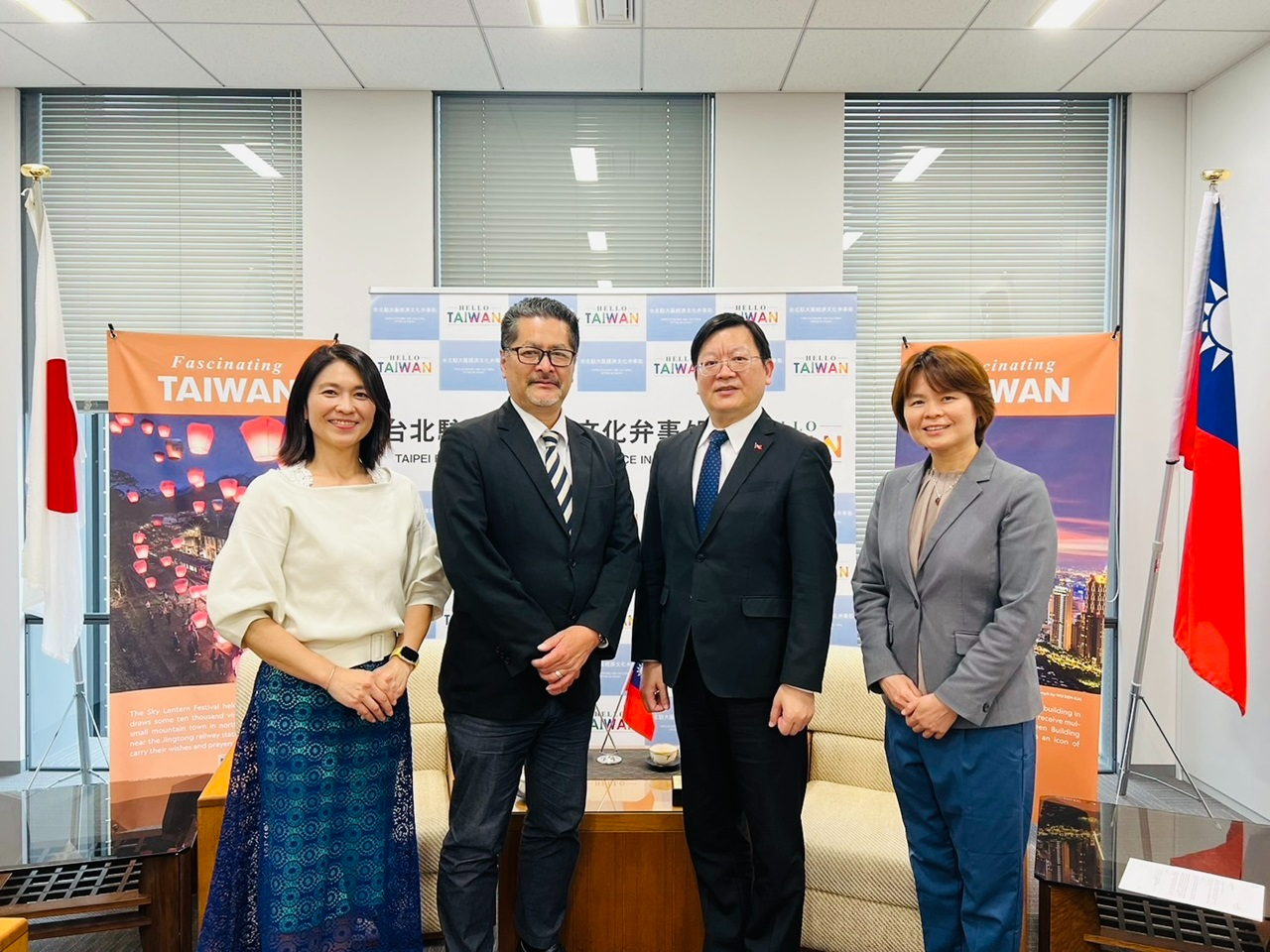 (左至右)鈴木知美主任、大阪女學院高校山崎哲嗣校長、駐大阪辦事處洪英傑處長、林育柔教育秘書