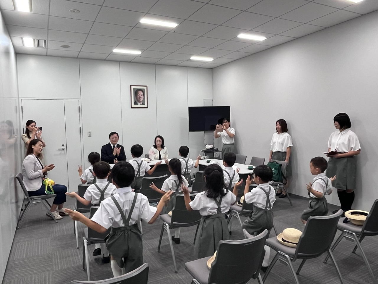 大阪橋波幼兒舍訪台團師生一行,由水原尚子理事長率領,於本(113)年9月6日前來本處拜會。洪英傑處長偕林育柔秘書等同仁與幼稚園小朋友互動交流,除聽取行程內容,並欣賞小朋友特別練習的中文招呼語及帶動唱表演。