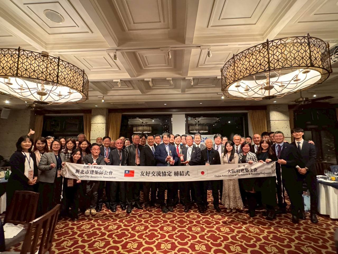 本處洪處長於本(2025)年11月27日晚間受邀出席見證新北市建築師公會與大阪府建築士會締結友好交流協定,簽署儀式由台方公會汪理事長俊男、日方公會岡本森廣會長及洪處長三人代表致詞。