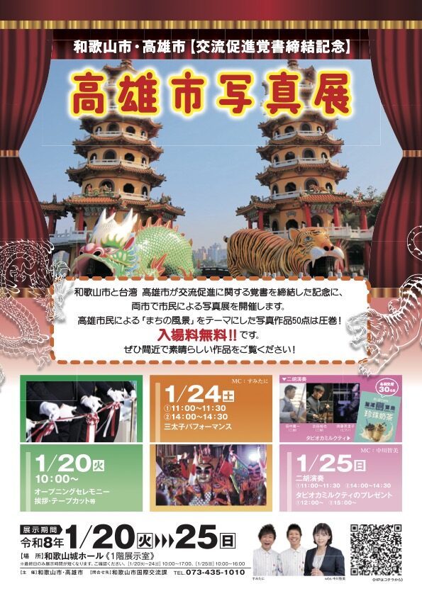 本處洪處長應邀於1月20日上午出席「和歌山市•高雄市締結交流促進備忘錄紀念攝影展」剪綵活動,並與和歌山市鶴卷郁夫副市長、市議會芝本和己議長及日台議聯丹羽直子副會長一同剪綵,會場播放高雄市長陳其邁祝賀影片,並安排兒童表演太鼓,活動順利圓滿。