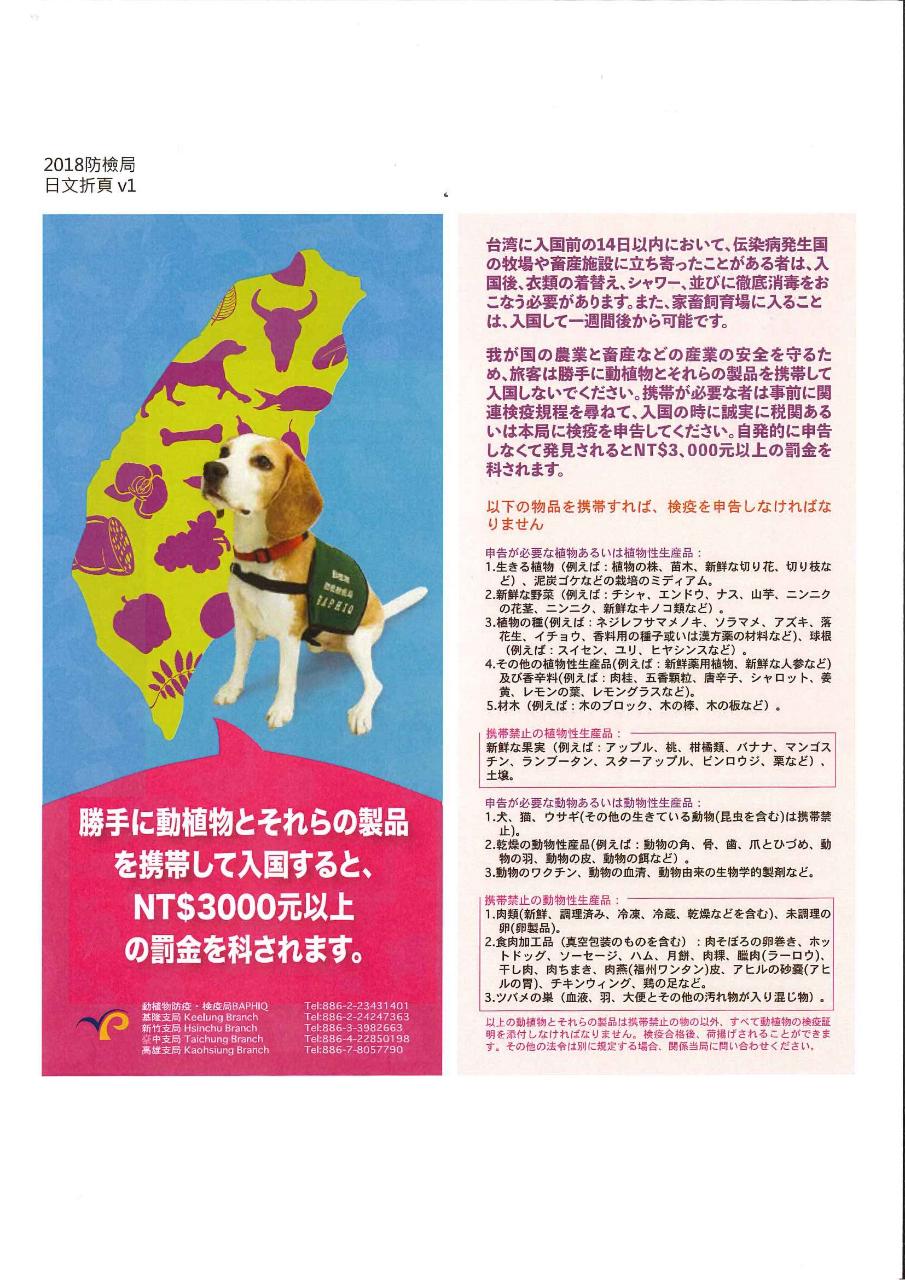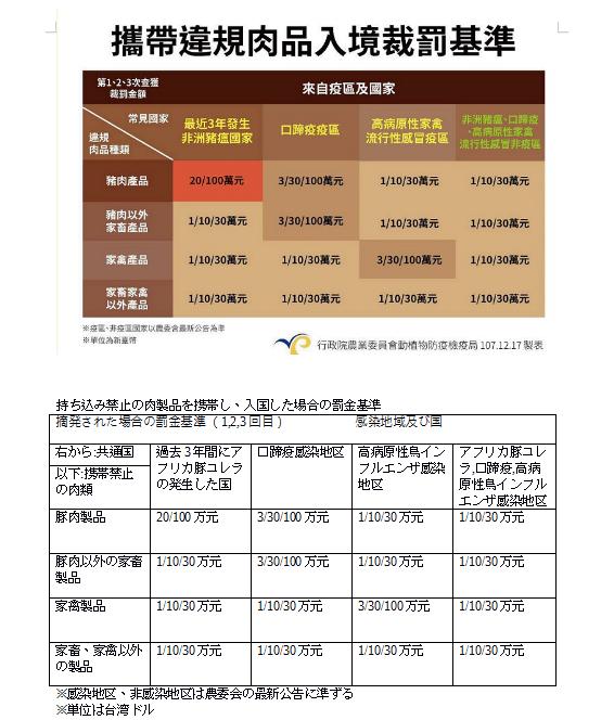 台湾での口蹄疫およびアフリカ豚コレラの拡大を防ぐため、行政院農業委員会動植物防疫検査局は、勝手に豚肉製品を携帯して入国すると、最高100万台湾元の罰金を科すと発表した。