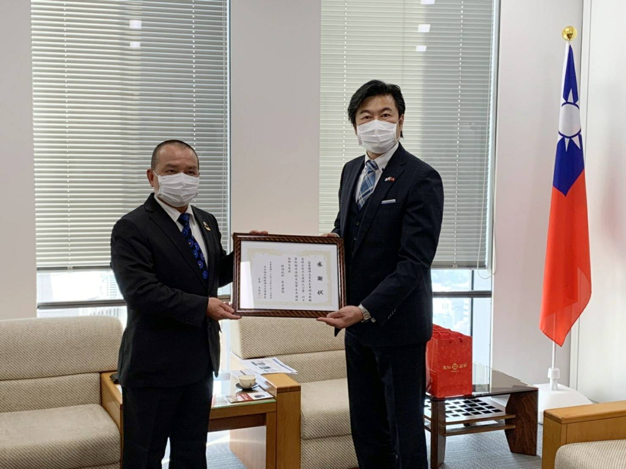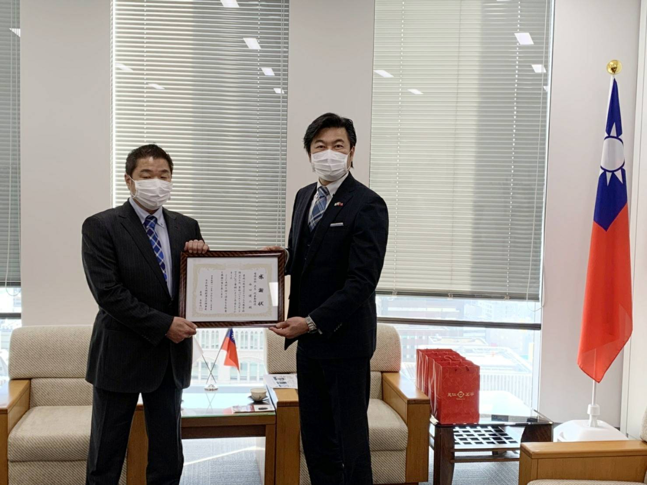 1 月 27日 鳥取県に本社をおく有限会社大志の谷口健二社長と同社の井上卓哉所長、そして岡野幸司氏が陳高賓・僑務促進委員とともに駐大阪弁事処を訪問し、李世丙処長、林明秋経済部長及び楊慧萍僑務課長が歓待した。谷口社長、陳促進委員は有限会社大志が生産している感染防止用マスクを当処を通して寄贈したことから、李処長は特別に感謝状を授与した。また、台日双方の感染症の状況や防疫措置、及び農業などについて意見を交わした。