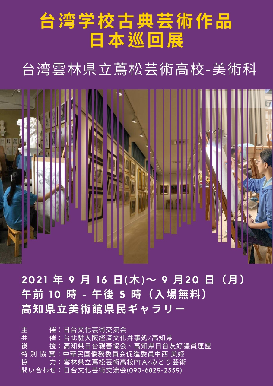 日台文化芸術交流会主催「台湾学校古典芸術作品&水彩画作品 日本巡回展」が9月16日(木)から9月20日(月)まで高知県立美術館にて展示されます。