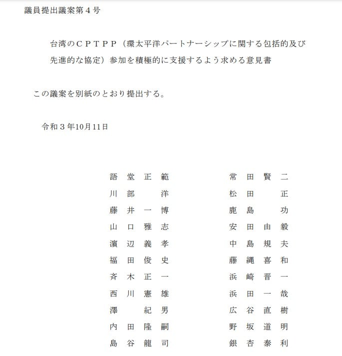 鳥取県議会 台湾のCPTPP参加支持意見