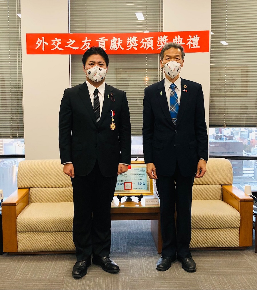 20220222駐大阪辦事處向明德處長頒贈「外交之友貢獻獎」獎章予「神戶市議會日華親善議員聯盟」上畠寬弘事務局長