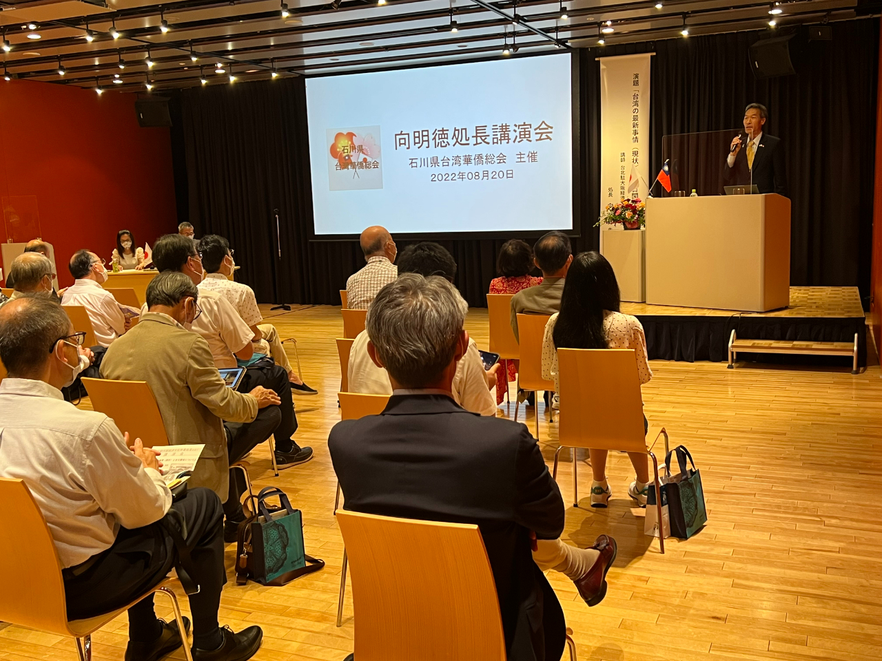 向明徳・駐大阪弁事処長は8月19日、楊慧萍・僑務課長および曾文琪・課長とともに、高仙桃・「石川県台湾華僑総会」会長、陳文筆・名誉会長ら立ち会いのもと、温井伸・「北國新聞社」社長および砂塚隆広・専務取締役を訪問し、向処長は取材に応じた。 同日夜、向処長一行は「石川県台湾華僑総会」主催の歓迎会に出席し、出席者は高仙桃・会長、陳文筆・名誉会長、陳志榮・顧問らほか、中村勲・「石川県議員日台親善友好連盟」会長、山野之義・前金沢市長、小宮ジョセフ・エバー航空小松空港支店長ら約20名が出席、台日交流や小松空港‐桃園空港路線再開などの議題について意見交換し、出席者は一刻も早くコロナが収束し台日間の経済・観光などの交流が回復することを願った。 翌8月20日、向処長は「石川県台湾華僑総会」の招待を受け、北國新聞社交流ホールにて「台湾の最新事情と台日関係について」をテーマに講演を行い、講演会は陳文筆・名誉会長によって順調に執り行われた。 当日は大雨の中、中村勲・「石川県議員日台親善友好連盟」会長ら約80名が出席し聴講、出席者らは講演会終了後も引き続き向処長と講演内容について意見交換を行った。