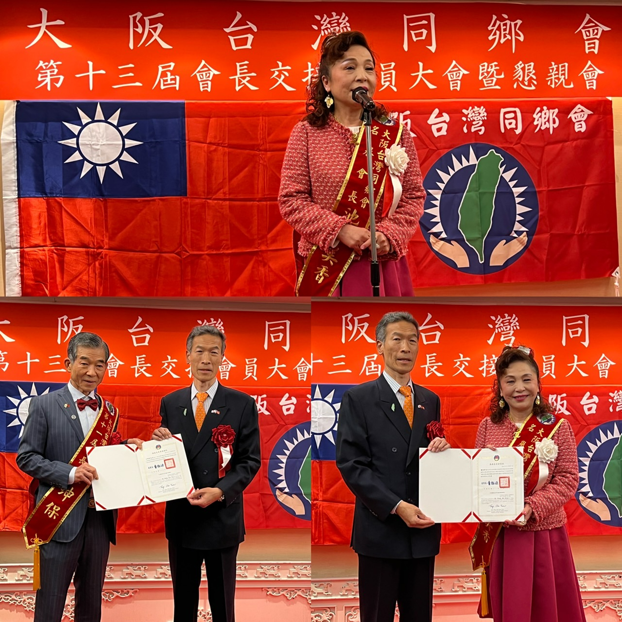 向明徳・駐大阪弁事処長は11月20日、周淑玉・処長夫人および楊慧萍・僑務課長とともに「大阪台湾同郷会第13回会長交代式典および懇親会」へ出席し、向処長立ち会いのもと、任期を満了した王坤保会長より謝美香・新任会長へ会印が引き継がれた。また、僑務委員会を代表し向処長が賀状と感謝状をそれぞれ王会長と謝会長へ授与した。 向処長は挨拶で、謝会長が高票を獲得し、再び会長になられたことに対し祝福の意を表したほか、大阪台湾同郷会に成し遂げてほしい3つのお願い事を述べた。1つ目は毎月行われていた交流会を再開し、台湾人同士が繋がりを持てる場を設けること。2つ目は日本の政府機関や社会福祉機構と交流やボランティア活動を共催し、台日民間交流や日本社会に溶けこむことを促進すること。3つ目は大阪にいる若い世代の台湾人や同郷会幹部・会員のご子息、ご息女にも僑団活動へ参加してもらうことであると述べた。 今回は松本利明・大阪府議会議員、上畠寛弘・神戸市会議員、野田しょう子・東大阪市議会議員、関西地区の各僑団会長および同郷会幹部・会員ら約80名が出席し、張種德・名誉会長によって乾杯音頭が行われ、林寿美子・副会長の閉会挨拶をもって活気あふれる中、懇親会は幕を閉じた。