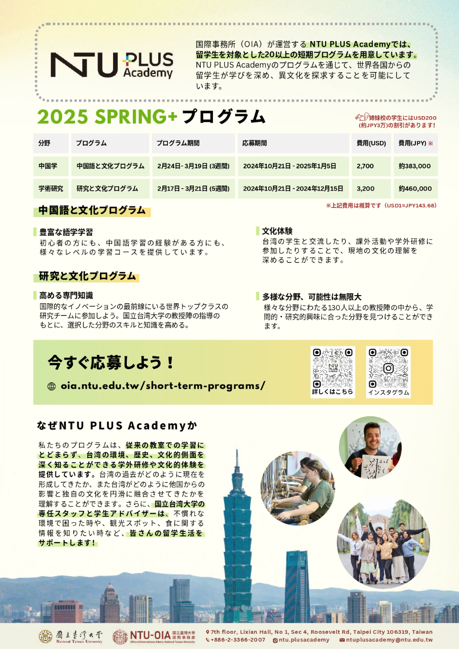 国立台湾大学国際事務処では、来年2~3月に「Plus Academy Spring+ Programs 華語レッスン&文化体験」を開講します。