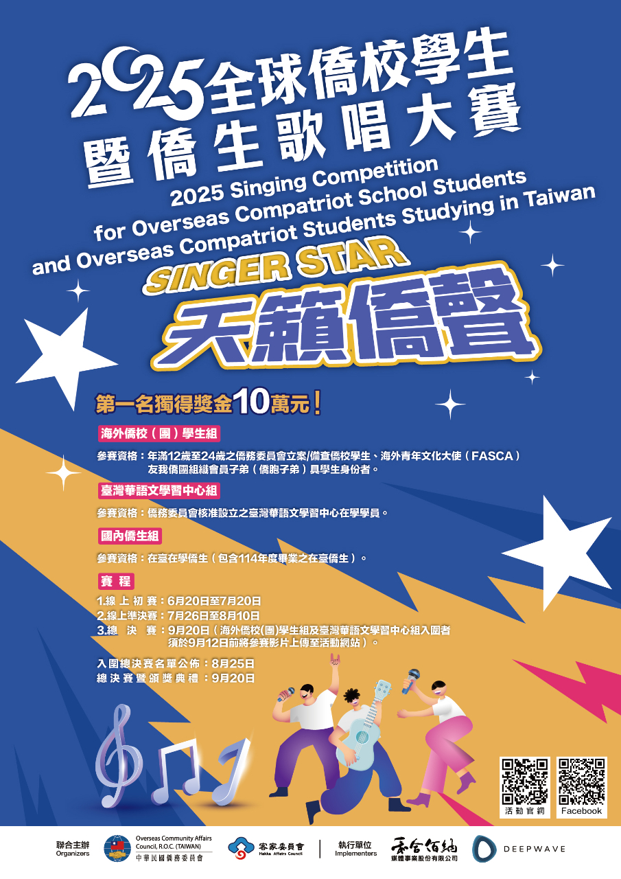 由僑務委員會與客家委員會聯合主辦之「2025年全球僑校學生暨僑生歌唱大賽」,正式開賽,歡迎符合資格之學生踴躍報名參加! 活動資訊 ■ 活動/比賽網站:https://singocac.tw ■ 活動辦法及參賽資格等:https://singocac.tw/rules ■ 初賽報名期間:2025年6月20日至7月20日止(台灣時間) ■ 參賽方式:至活動網站註冊後即可線上初賽
